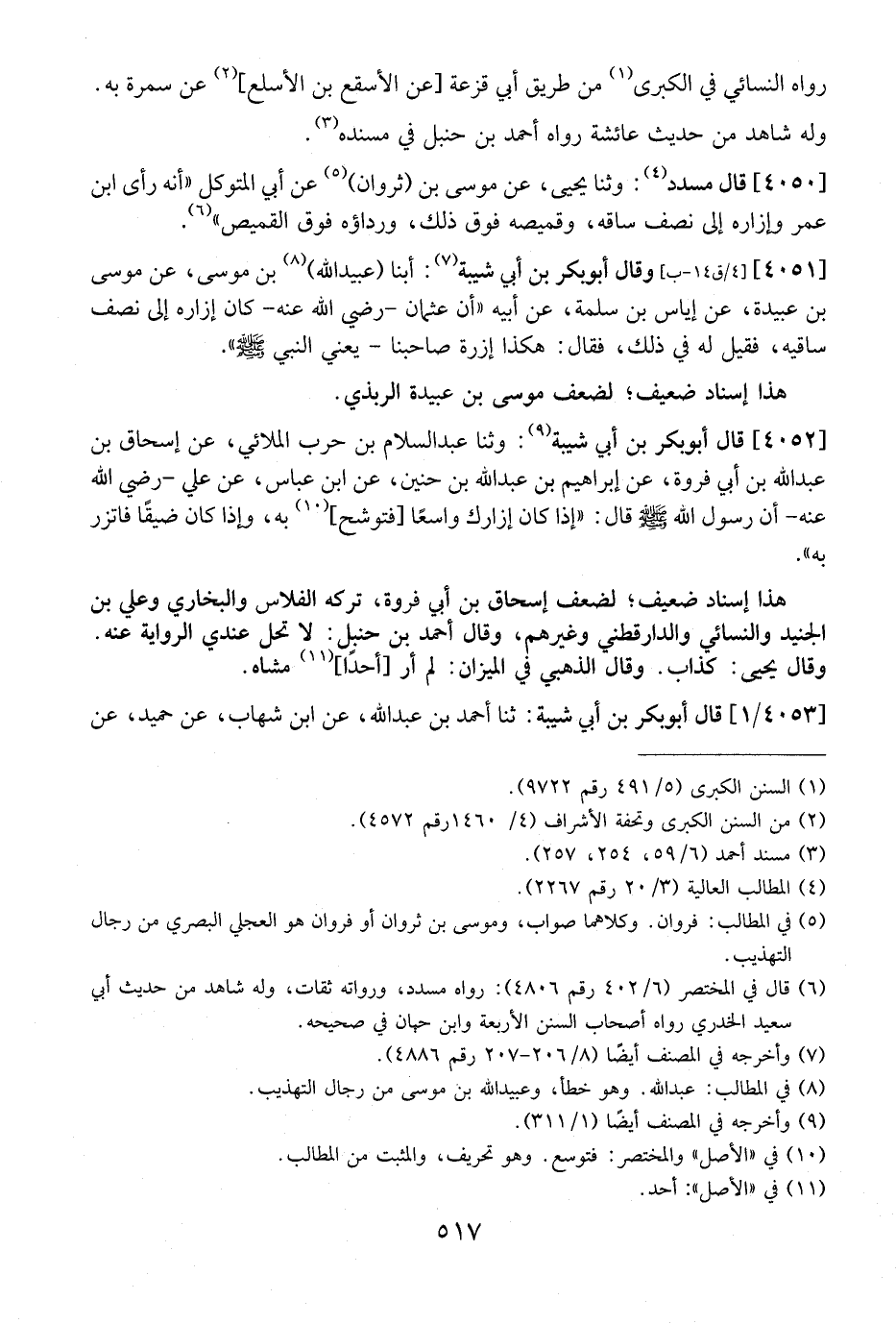 4051 -[4/ ق 14-ب] وقال أبو بكر بن أبي شيبة: أبنا (عُبَيْدُ اللَّهِ) بْنُ مُوسَى، عَنْ مُوسَى بْنِ عبيدة، عَنْ إِيَاسِ بْنِ سَلَمَةَ، عَنْ أَبِيهِ "أَنَّ عُثْمَانَ - رَضِيَ اللَّهُ عَنْهُ - كَانَ إِزَارُهُ إِلَى نِصْفِ سَاقَيْهِ، فَقِيلَ لَهُ فِي ذَلِكَ، فَقَالَ: هَكَذَا إِزْرَةُ صَاحِبِنَا - يَعْنِي النَّبِيَّ - صَلَّى اللَّهُ عَلَيْهِ وَسَلَّمَ -".
