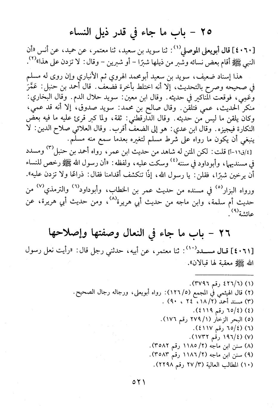 4060 - قَالَ أَبُو يَعْلَى الْمَوْصِلِيُّ: ثَنَا سُوَيْدُ بْنُ سَعِيدٍ، ثنا مُعْتَمِرٌ، عَنْ حُمَيْدٍ، عَنْ أَنَسٍ "أَنّ النَّبِيَّ - صَلَّى اللَّهُ عَلَيْهِ وَسَلَّمَ - أَقَامَ بَعْضَ نِسَائِهِ وَشَبِرَ مِنْ ذَيْلِهَا شِبْرًا -أَوْ شِبْرَيْنِ- وَقَالَ: لَا تَزِدْنَ عَلَى هَذَا".