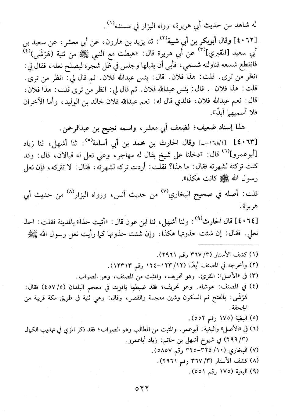 4062 - وَقَالَ أَبُو بَكْرِ بْنُ أَبِي شَيْبَةَ: ثَنَا يَزِيدُ بْنُ هَارُونَ، عَنْ أَبِي مَعْشَرٍ، عَنْ سَعِيدِ بْنِ أَبِي سَعِيدٍ [الْمَقْبُرِيِّ] عَنْ أَبِي هُرَيْرَةَ قَالَ: "هَبَطْتُ مَعَ النَّبِيِّ - صَلَّى اللَّهُ عَلَيْهِ وَسَلَّمَ - من ثنية (هَرْشَى) فَانْقَطَعَ شِسْعُهُ فَنَاوَلْتُهُ شِسْعِي، فَأَبَى أَنْ يَقْبَلَهَا وَجَلَسَ فِي ظِلِّ شَجَرَةٍ لِيُصْلِحَ نَعْلَهُ، فَقَالَ لِي: انْظُرْ مَنْ تَرَى. قُلْتُ: هَذَا فُلَانٌ. قَالَ: بِئْسَ عَبْدُ اللَّهِ فُلَانٌ. ثُمَّ قَالَ لِي: انْظُرْ مَنْ تَرَى.
