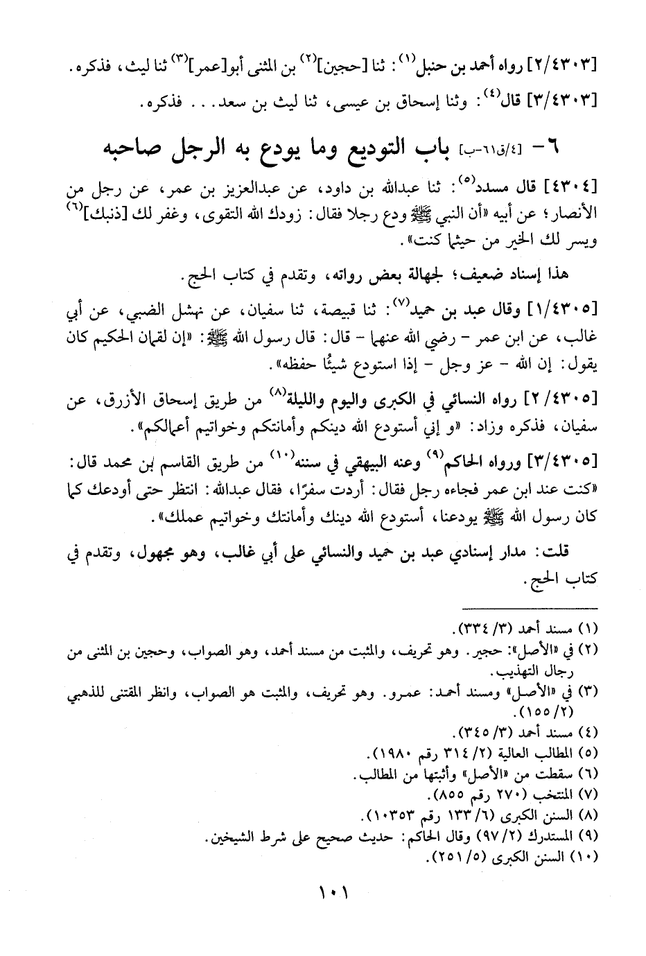 4305 / 3 - وَرَوَاهُ الْحَاكِمُ وَعَنْهُ الْبَيْهَقِيُّ فِي سُنَنِهِ مِنْ طَرِيقِ الْقَاسِمِ بْنِ مُحَمَّدٍ قَالَ: "كُنْتُ عِنْدَ ابْنِ عُمَرَ فَجَاءَهُ رَجُلٌ فَقَالَ: أَرَدْتُ سَفَرًا، فَقَالَ عَبْدُ اللَّهِ: انْتَظِرْ حَتَّى أُوَدِّعَكَ كَمَا كَانَ رَسُولُ اللَّهِ - صَلَّى اللَّهُ عَلَيْهِ وَسَلَّمَ - يُوَدِّعُنَا، أَسْتَوْدِعُ اللَّهَ دِينَكَ وَأَمَانَتَكَ وَخَوَاتِيمَ عَمَلِكَ ".