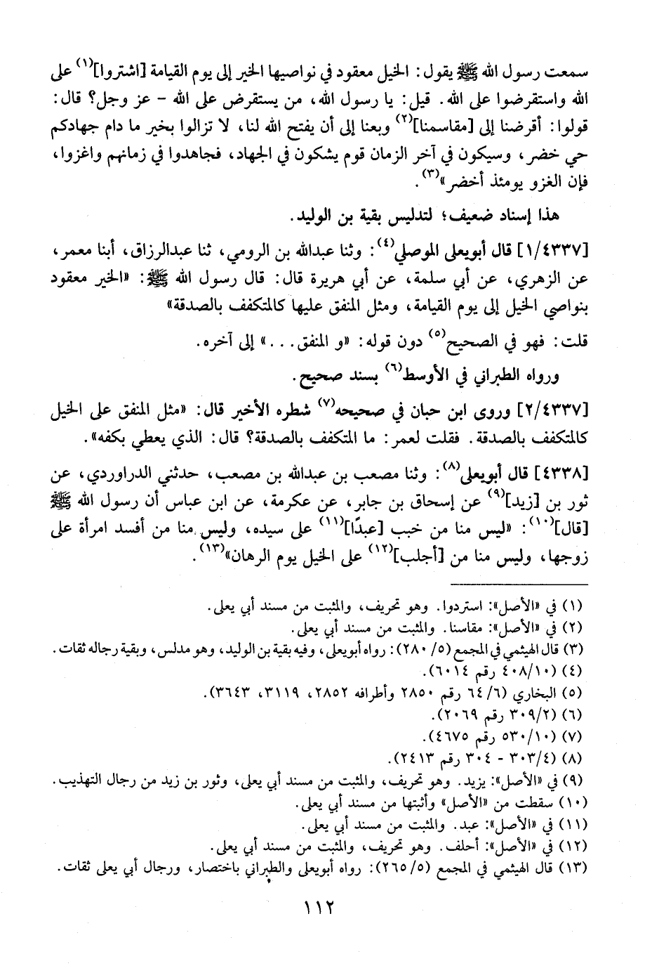 4337 / 1 - قَالَ أَبُو يَعْلَى الْمَوْصِلِيُّ: وَثَنَا عَبْدُ اللَّهِ بن الرومي، ثنا عبد الرزاق، أبنا مَعْمَرٌ، عَنِ الزُّهْرِيِّ، عَنْ أَبِي سَلَمَةَ، عَنْ أَبِي هُرَيْرَةَ قَالَ: قَالَ رَسُولُ اللَّهِ - صَلَّى اللَّهُ عَلَيْهِ وَسَلَّمَ -: ((الْخَيْرُ مَعْقُودٌ بِنَوَاصِي الْخَيْلِ إِلَى يَوْمِ الْقِيَامَةِ، وَمَثَلُ الْمُنْفِقِ عَلَيْهَا كَالْمُتَكَفِّفِ بالصدقة"
