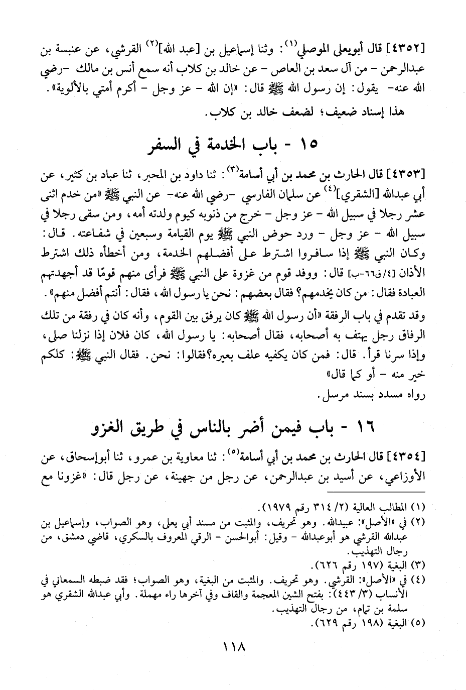 4353 - قَالَ الْحَارِثُ بْنُ مُحَمَّدِ بْنِ أَبِي أُسَامَةَ: ثنا دَاوُدُ بْنُ الْمُحَبَّرِ، ثنا عَبَّادُ بن كثير، عن أبي عبد الله الشقري عَنْ سَلْمَانَ الْفَارِسِيِّ- رَضِيَ اللَّهُ عَنْهُ- عَنِ النَّبِيِّ - صَلَّى اللَّهُ عَلَيْهِ وَسَلَّمَ - ((مَنْ خَدَمَ اثنى عَشَرَ رَجُلًا فِي سَبِيلِ اللَّهِ- عَزَّ وَجَلَّ- خَرَجَ مِنْ ذُنُوبِهِ كَيَوْمِ وَلَدَتْهُ أُمُّهُ، وَمَنْ سَقَى رَجُلًا فِي سَبِيلِ اللَّهِ- عَزَّ وَجَلَّ- وَرَدَ حَوْضَ النَّبِيِّ - صَلَّى اللَّهُ عَلَيْهِ وَسَلَّمَ - يَوْمَ الْقِيَامَةِ وَسَبْعِينَ فِي شَفَاعَتِهِ. قَالَ: وَكَانَ النَّبِيُّ - صَلَّى اللَّهُ عَلَيْهِ وَسَلَّمَ - إِذَا سَافَرُوا اشْتَرَطَ عَلَى أَفْضَلِهِمِ الْخِدْمَةِ، وَمَنْ أَخْطَأَهُ ذَلِكَ اشْتَرَطَ الْأَذَانَ قَالَ: وَوَفَدَ قَوْمٌ مِنْ غَزْوَةٍ عَلَى النَّبِيِّ - صَلَّى اللَّهُ عَلَيْهِ وَسَلَّمَ - فَرَأَى منهم قومًا قد أجهدتهم الْعِبَادَةُ فَقَالَ: مَنْ كَانَ يَخْدِمُهُمْ؟ فَقَالَ بَعْضُهُمْ: نَحْنُ يَا رَسُولَ اللَّهِ، فَقَالَ: أَنْتُمْ أَفْضَلُ مِنْهُمْ ". وَقَدْ تَقَدَّمَ فِي بَابِ الرُّفْقَةِ "أَنَّ رسوله اللَّهِ - صَلَّى اللَّهُ عَلَيْهِ وَسَلَّمَ - كَانَ يَرْفُقُ بَيْنَ الْقَوْمِ، وَأَنَّهُ كَانَ فِي رُفْقَةٍ مِنْ تِلْكَ الرِّفَاقِ رَجُلٌ يَهْتِفُ بِهِ أَصْحَابُهُ، فَقَالَ أَصْحَابُهُ: يَا رَسُولَ اللَّهِ، كَانَ فُلَانٌ إِذَا نَزَلْنَا صَلَّى، وَإِذَا سِرْنَا قَرَأَ. قَالَ: فَمَنْ كَانَ يَكْفِيهِ عَلْفَ بَعِيرِهِ؟ فَقَالُوا: نَحْنُ. فَقَالَ النَّبِيُّ - صَلَّى اللَّهُ عَلَيْهِ وَسَلَّمَ -: كُلُّكُمْ خَيْرٌ مِنْهُ- أَوْ كَمَا قَالَ "
