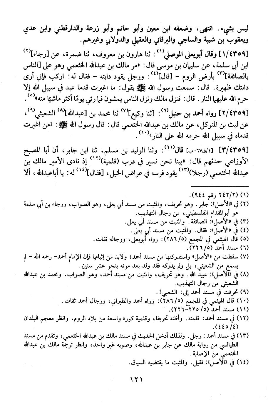4359 / 3 - قَالَ: وثنا الْوَلِيدُ بْنُ مُسْلِمٍ، ثنا ابْنُ جَابِرٍ، أن أبا المصبح الأوزاعي حدثهم قال: "بينا نحن نسير في درب (قلمية) إِذْ نَادَى الْأَمِيرُ مَالِكُ بْنُ عَبْدِ اللَّهِ الخثعمي (رجلا) يقود فرسه في عراض الخيل، أَفقال، له: يا أباعبد الله، ألا