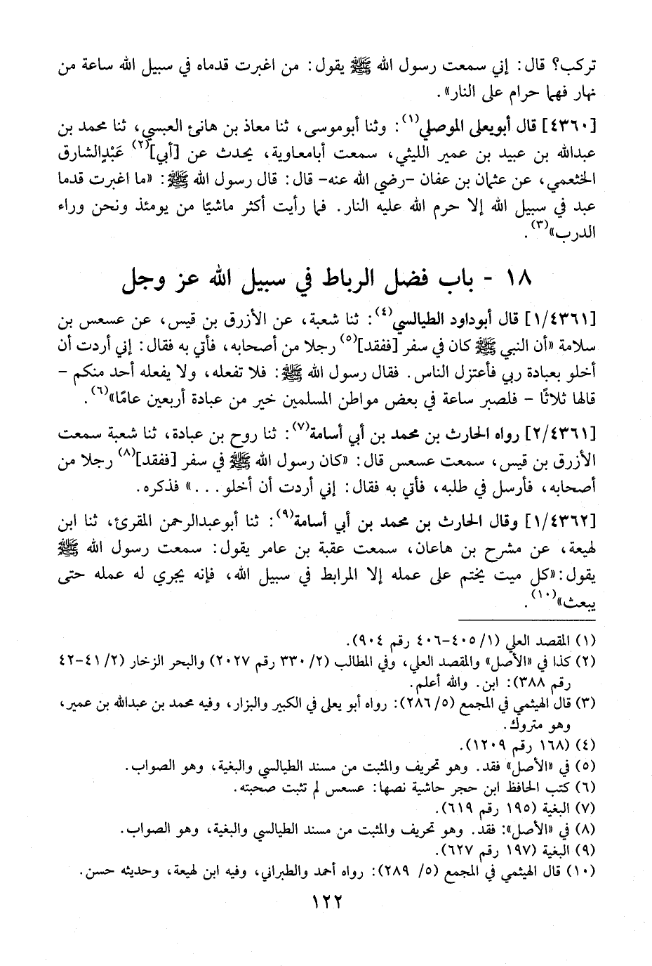 4360 - قَالَ أَبُو يَعْلَى الْمَوْصِلِيُّ: وَثَنَا أَبُو مُوسَى، ثنا مُعَاذُ بْنُ هَانِئٍ العبسي، ثنا مُحَمَّدُ بْنُ عَبْدِ اللَّهِ بْنِ عُبَيْدِ بن عمير الليثي، سمعت أبامعاوية، يحدث عن أبي عبد الشارق الْخَثْعَمِيِّ، عَنْ عُثْمَانَ بْنِ عَفَّانَ- رَضِيَ اللَّهُ عَنْهُ- قَالَ: قال رسوله اللَّهِ - صَلَّى اللَّهُ عَلَيْهِ وَسَلَّمَ -: ((مَا اغْبَرَّتْ قَدَمَا عَبْدٍ فِي سَبِيلِ اللَّهِ إِلَّا حَرَّمَ اللَّهُ عَلَيْهِ النَّارَ. فَمَا رَأَيْتُ أَكْثَرَ مَاشِيًا مِنْ يَوْمِئِذٍ وَنَحْنُ وَرَاءَ الدَّرْبِ ".
