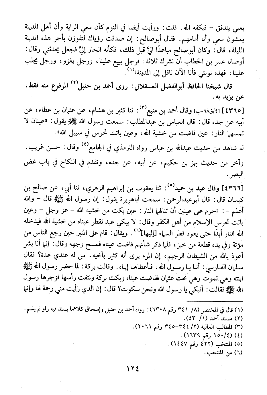 4366 - وَقَالَ عَبْدُ بْنُ حُمَيْدٍ: ثنا يَعْقُوبُ بْنُ إِبْرَاهِيمَ الزُّهْرِيُّ، ثنا أَبِي، عَنْ صَالِحِ بْنِ كَيْسَانَ قَالَ: قَالَ أَبُو عَبْدِ الرحمن: سمعت أباهريرة يَقُولُ: إِنَّ رَسُولَ اللَّهِ - صَلَّى اللَّهُ عَلَيْهِ وسلم - قال- وَاللَّهُ أَعْلَمُ-: "حُرِّمَ عَلَى عَيْنَيْنِ أَنْ تَنَالَهُمَا النَّارُ: عَيْنٌ بَكَتْ مِنْ خَشْيَةِ اللَّهِ- عَزَّ وَجَلَّ- وَعَيْنٌ بَاتَتْ تحرس الإسلام مِنْ أَهْلِ الْكُفْرِ وَقَالَ: لَا يَبْكِي عَبْدٌ تقطر عَيْنَاهُ مِنْ خَشْيَةِ اللَّهِ فَيُدْخِلُهُ اللَّهُ النَّارَ أبدًا حتى يعود قطر السماء أإِلَيْهَا،. وَيُقَالُ: قَامَ عَلَى الْمِنْبَرِ حِينَ رَجَعَ النَّاسُ مِنْ مُؤْتَةَ وَفِي يَدِهِ قِطْعَةٌ مِنْ خبز، فلما ذكر شأنهم فَاضَتْ عَيْنَاهُ فَمَسَحَ وَجْهَهُ وَقَالَ: إِنَّمَا أَنَا بشر أعوذ بالله من الشيطان الرجيم، إِنَّ الْمَرْءَ يَرَى أَنَّهُ كَثِيرٌ بِأَخِيهِ، مَنْ له عندي عدة؟ فقال سلمان الفارلصي: أنا يا رسول الله. فأعطاها إياه. وقال بَرَكَةُ: لَمَّا حَضَرَ رَسُولَ اللَّهِ - صَلَّى اللَّهُ عَلَيْهِ وَسَلَّمَ - ابْنَتَهُ وَهُيَ تَمُوتُ وَهِيَ تَحْتَ عثمان ففاضت عَيْنَاهُ وَبَكَتْ بَرَكَةُ وَنَتَفَتْ رَأْسَهَا فَزَجَرَهَا رَسُولُ الله - صلى الله عليه وسلم - هيرو فقال: أَتَبْكِي يَا رَسُولَ اللَّهِ وَنَحْنُ سُكُوتٌ؟ قَالَ: إِنَّ الَّذِي رَأَيْتِ مِنِّي رَحْمَةً لَهَا وَإِنَّمَا