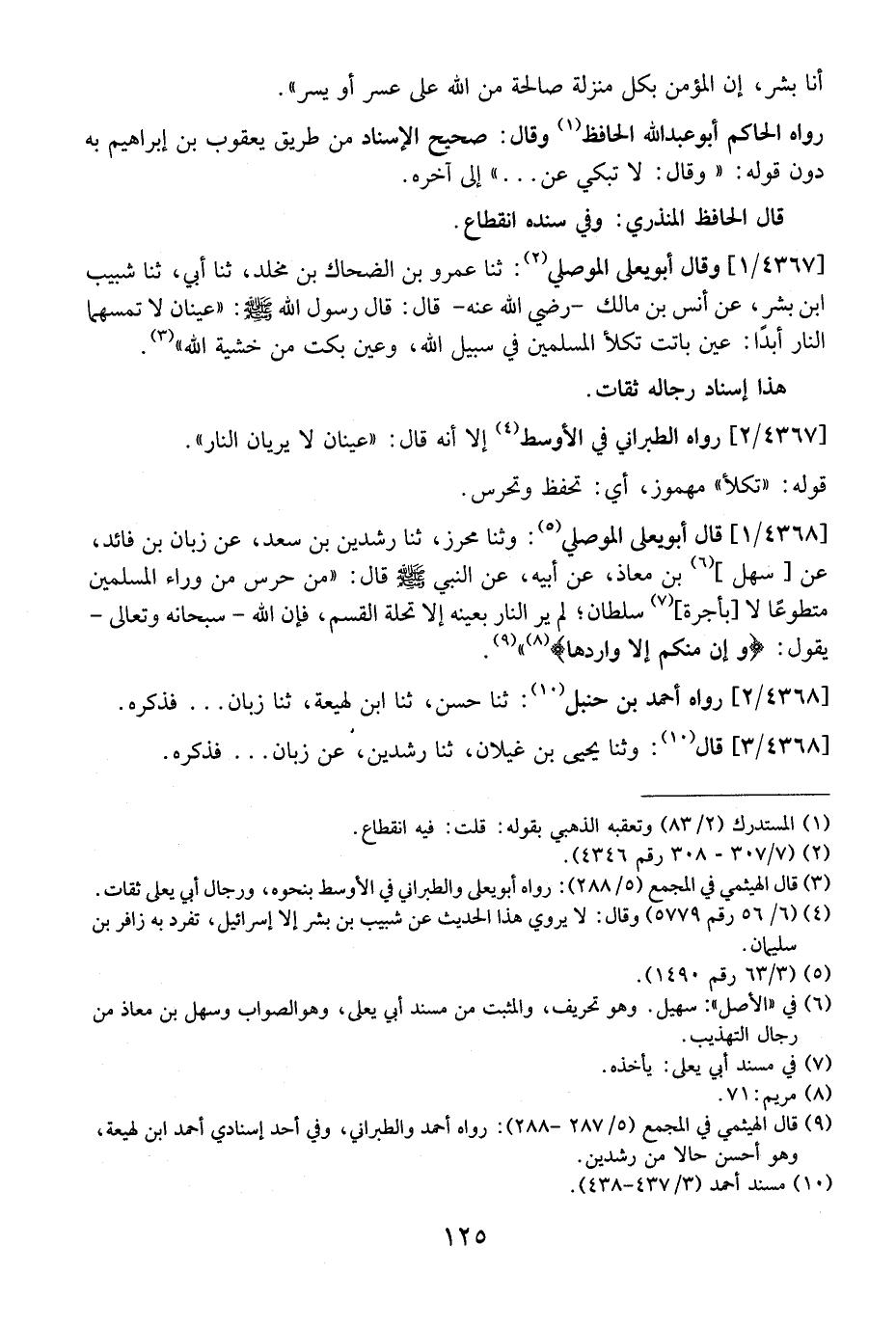 4367 / 1 - وَقَالَ أَبُو يَعْلَى الْمَوْصِلِيُّ: ثَنَا عَمْرُو بْنُ الضَّحَّاكِ بْنِ مَخْلَدٍ، ثنا أَبِي، ثنا شبيب ابن بِشْرٍ، عَنْ أَنَسِ بْنِ مَالِكٍ- رَضِيَ اللَّهُ عَنْهُ- قَالَ: قَالَ رَسُولُ اللَّهِ - صَلَّى اللَّهُ عَلَيْهِ وَسَلَّمَ -: ((عَيْنَانِ لَا تَمَسُّهُمَا النَّارُ أَبَدًا: عَيْنٌ بَاتَتْ تَكْلَأ الْمُسْلِمِينَ فِي سَبِيلِ اللَّهِ، وَعَيْنٌ بَكَتْ مِنْ خَشْيَةِ اللَّهِ ".
