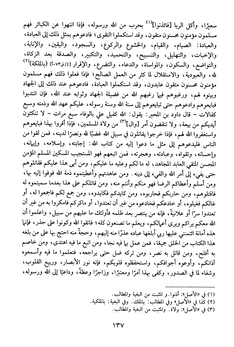 سعيًرا، وأكل الربا فائذنوا بِحَرْبٍ مِنَ اللَّهِ وَرَسُولِهِ، فَإِذَا انْتَهُوا عَنِ الْكَبَائِرِ فُهُمْ مُسْلِمُونَ مُؤْمِنُونَ مُحْسِنُونَ مُتَّقُونَ، وَقَدْ استكملوا التقوى؟ فادعوهم بمثل ذلك إلى العبادة، والعبادة: الصيام، والقيام، وَالْخُشُوعُ وَالرُّكُوعُ، وَالسُّجُودُ، وَالْيَقِينُ، وَالْإِنَابَةُ، وَالْإِخْبَاتُ، وَالتَّهْلِيلُ، والتسبيح، والتحميد، والتكبير، والصدقة بعد الزكاة، وا لتواضع، والسكون، والمواساة، والدعاء، والتضرع، وا لإقرار (با لملكة) لله، والعبودية، والاستقلال لما كثر مِنَ الْعَمَلِ الصَّالِحِ؟ فَإِذَا فَعَلُوا ذَلِكَ فَهُمْ مُسْلِمُونَ مُؤْمِنُونَ مُحْسِنُونَ مُتَّقُونَ عَابِدُونَ، وَقَدِ اسْتَكْمَلُوا الْعِبَادَةَ، فَادْعُوهُمْ عِنْدَ ذَلِكَ إِلَى الْجِهَادِ وَبَيِّنُوهُ لَهُمْ، وَرَغِّبُوهُمْ فِيمَا رَغَّبَهُمُ اللَّهُ مِنَ فَضِيلَةِ الْجِهَادِ وَثَوَابِهِ عِنْدَ اللَّهِ، فَإِنِ انْتَدَبُوا فَبَايِعُوهُمْ وَادْعُوهُمْ حَتَّى تُبَايِعُوهُمْ إِلَى سُنَّةِ اللَّهِ وَسُنَّةِ رَسُولِهِ، عَلَيْكُمْ عَهِدَ اللَّهُ وذِمَّتَهُ وَسَبْعُ كِفَالَاتٍ- قَالَ دَاوُدُ بْنُ الْمُحَبَّرِ: يَقُولُ: اللَّهُ كَفِيلٌ عَلَيَّ بِالْوَفَاءِ سَبْعَ مَرَّاتٍ- لَا تَنْكُثُونَ أَيْدِيكُمْ مِنْ بَيْعَةٍ، وَلَا تَنْقُضُونَ أَمْرَ وَالٍ مِنَ وُلَاةِ الْمُسْلِمِينَ، فَإِذَا أَقَرُّوا بِهَذَا فَبَايِعُوهُمْ وَاسْتَغْفِرُوا اللَّهَ لَهُمْ، فَإِذَا خَرَجُوا يُقَاتِلُونَ فِي سَبِيلِ اللَّهِ غَضَبًا لِلَّهِ وَنَصْرًا لِدِينِهِ، فَمَنْ لَقُوا من الناس فليدعوهم إلى مثل مَا دَعَوْا إِلَيْهِ مِنْ كِتَابِ اللَّهِ: إِجَابَتَهُ، وَإِسْلَامَهُ، وَإِيمَانَهُ، وَإِحْسَانَهُ، وَتَقْوَاهُ، وَعِبَادَتُهُ، وَهِجْرَتُهُ، فَمَنِ اتَّبَعَهُمْ فَهُوَ الْمُسْتَجِيبُ الْمِسْكِينُ الْمُسْلِمُ الْمُؤْمِنُ الْمُحْسِنُ الْمُتَّقِي الْعَابِدُ الْمُجَاهِدُ، لَهُ مَا لَكُمْ وَعَلَيْهِ مَا عَلَيْكُمْ، وَمَنْ أَبَى هَذَا عَلَيْكُمْ فَقَاتِلُوهُمْ حَتَّى يَفِيءَ إِلَى أَمْرِ اللَّهِ وَالْفَيء إِلَى دينها ومن عاهدتهم وَأَعْطَيْتُمُوهُ ذِمَّةَ اللَّهِ فَوَفُّوا إِلَيْهِ بِهَا، وَمَنْ أَسْلَمَ وَأَعْطَاكُمُ الرِّضَا فَهُوَ مِنْكُمْ وَأَنْتُمْ مِنْهُ، وَمَنْ قَاتَلَكُمْ عَلَى هَذَا بَعْدَمَا سَمَّيْتُمُوهُ لَهُ فاقتلوهم، ومن حاربكم فحاربوه، ومن كايدكم فكايدوه، وَمَنْ جَمَعَ لَكُمْ فَاجْمَعُوا لَهُ، أَوْ غَالَكُمْ فَغِيلُوهُ، أَوْ خَادَعَكُمْ فَخَادِعُوهُ مِنْ غَيْرِ أَنْ تعتدوا، أو مَاكَرَكُمْ فَامْكُرُوا بِهِ مِنْ غَيْرِ أَنْ تَعْتَدُوا سِرًّا أَوْ عَلَانِيَةً، فَإِنَّهُ مَنْ يَنْتَصِرُ بَعْدَ ظُلْمِهِ فَأُولَئِكَ مَا عَلَيْهِمْ مِنْ سَبِيلٍ، وَاعْلَمُوا أَنَّ اللَّهَ مَعَكُمْ يَرَاكُمْ وَيَرَى أَعْمَالَكُمْ، وَيَعْلَمُ مَا تَصْنَعُونَ كُلَّهُ؟ فَاتَّقُوا اللَّهَ وَكُونُوا عَلَى حَذَرٍ، فإِنِمَّا هَذِهِ أَمَانَةٌ ائْتَمَنَنِي عَلَيْهَا رَبِّي أُبَلِّغُهَا عِبَادَهُ عُذْرًا مِنْهُ إِلَيْهِمْ، وَحُجَّةً مِنْهُ احْتَجَّ بِهَا عَلَى مَنْ بَلَغَهُ هَذَا الْكِتَابُ مِنَ الْخَلْقِ جَمِيعًا، فَمَنْ عَمِلَ بِمَا فِيهِ نَجَا، وَمَنِ اتَّبَعَ مَا فِيهِ اهْتَدَى، وَمَنْ خَاصَمَ بِهِ أَفْلَحَ، وَمَنْ قَاتَلَ بِهِ نُصِرَ، وَمَنْ تَرَكَهُ ضَلَّ حَتَّى يُرَاجِعَهُ، فَتَعَلَّمُوا مَا فِيهِ وَأَسْمِعُوهُ آذَانَكُمْ، وَأَوْعُوهُ أَجْوَافَكُمْ، وَاسْتَحْفِظُوهُ قُلُوبَكُمْ، فإنه نور الأبصار، وربيع القلوب، وشفاء لما في الصدور، وكفى بهذا آمرًا ومعتبًرا، وزاجرًا وعظةً، وداعيًا إِلَى اللَّهِ وَرَسُولِهِ،
