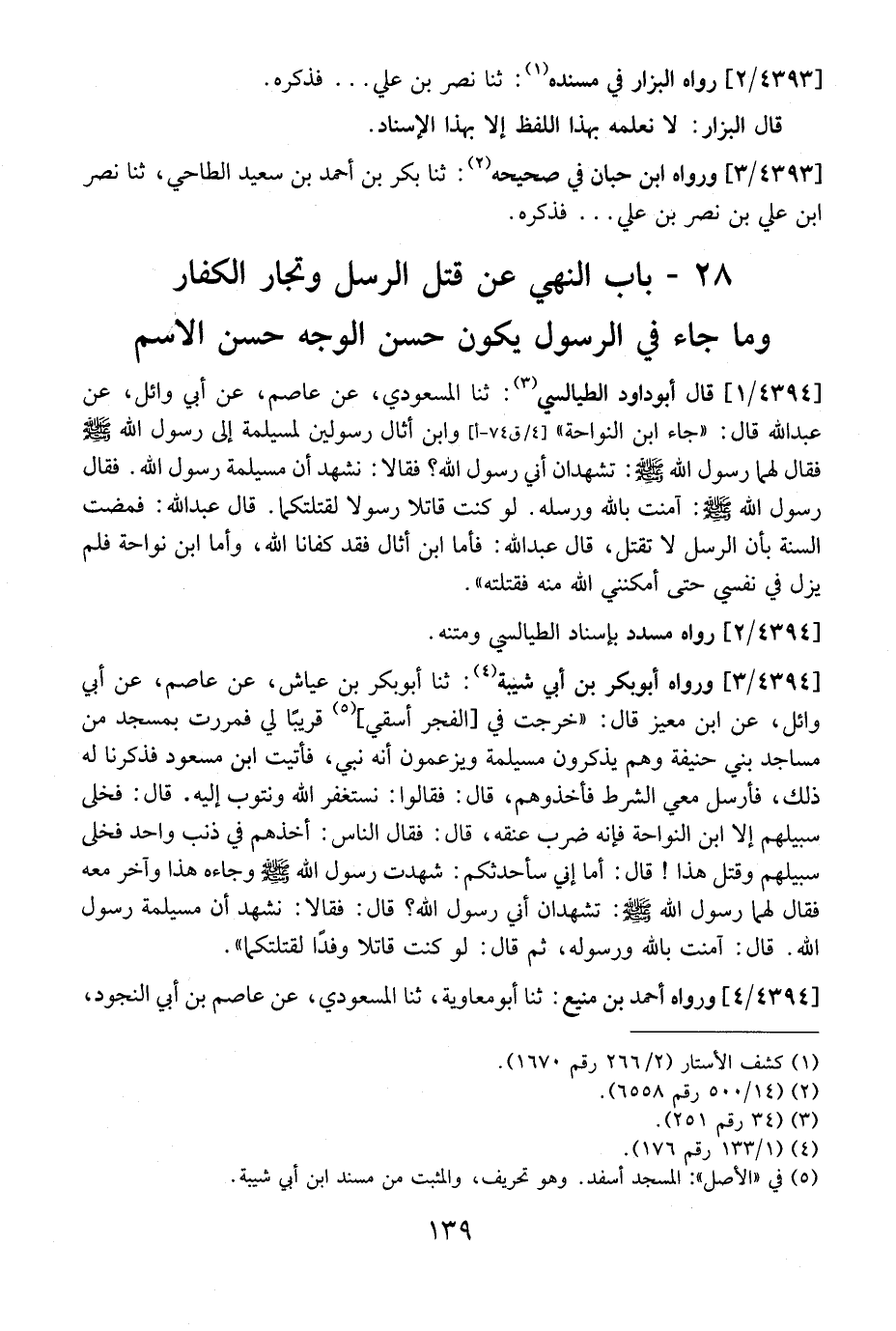4394 / 1 - قَالَ أَبُو دَاوُدَ الطَّيَالِسِيُّ: ثَنَا الْمَسْعُودِيُّ، عَنِ عَاصِمٌ، عَنْ أَبِي وَائِلٍ، عَنْ عَبْدِ اللَّهِ قَالَ: "جَاءَ ابْنُ النَّوَّاحَةِ" وَابْنُ أَثَالٍ رَسُولَيْنِ لِمُسَيْلَمَةَ إلى رسوله الله فَقَالَ لَهُمَا رَسُولُ اللَّهِ - صَلَّى اللَّهُ عَلَيْهِ وَسَلَّمَ -: تَشْهَدَانِ أَنِّي رَسُولُ اللَّهِ؟ فَقَالَا: نَشْهَدُ أن مسيلمة رسول الله - صلى الله عليه وسلم -. فقال رَسُولُ اللَّهِ - صَلَّى اللَّهُ عَلَيْهِ وَسَلَّمَ -: آمَنْتُ بِاللَّهِ وَرُسُلِهِ. لَوْ كُنْتُ قَاتِلًا رَسُولًا لَقَتَلْتُكُمَا. قال عبد الله: فمضت السنة بأن الرسل لا تقتل، قال عبد الله: فأما ابن أثال فقد كفانا الله، وأما ابن نواحة فَلَمْ يَزَلْ فِي نَفْسِي حَتَّى أَمْكَنَنِي اللَّهُ مِنْهُ فَقَتَلْتُهُ ".