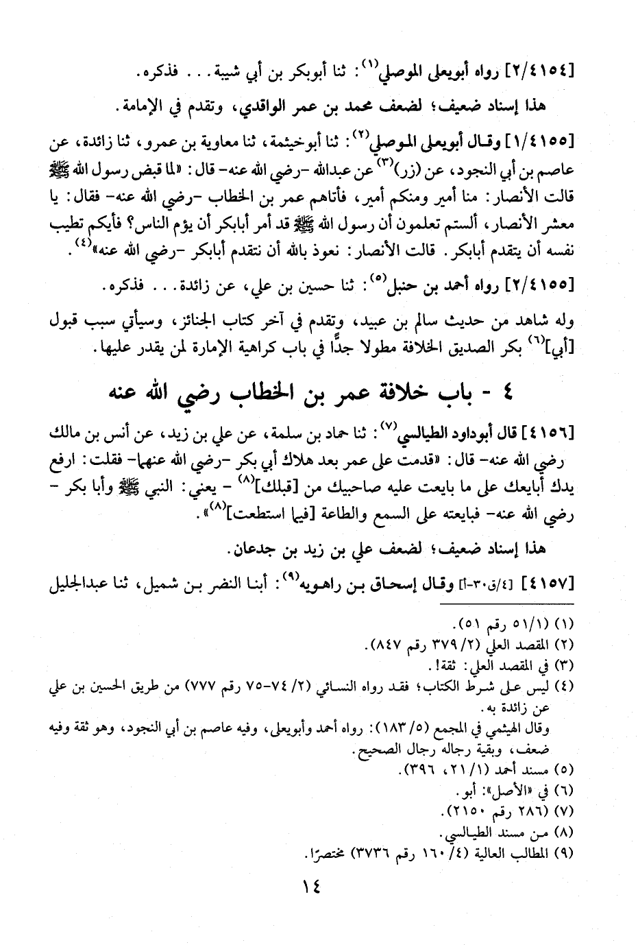 4155 / 1 - وَقَالَ أَبُو يَعْلَى الْمَوْصِلِيُّ: ثَنَا أَبُو خَيْثَمَةَ، ثَنَا مُعَاوِيَةُ بْنُ عَمْرٍو، ثَنَا زَائِدَةُ، عَنْ عَاصِمِ بْنِ أَبِي النُّجُودِ، عَنْ (زِرٍّ) عَنْ عَبْدِ اللَّهِ- رَضِيَ اللَّهُ عَنْهُ- قَالَ: "لَمَّا قُبِضَ رَسُولُ اللَّهِ - صَلَّى اللَّهُ عَلَيْهِ وَسَلَّمَ - قَالَتِ الْأَنْصَارُ: مِنَّا أَمِيرٌ وَمِنْكُمْ أَمِيرٌ، فَأَتَاهُمْ عُمَرَ بْنَ الْخَطَّابِ- رَضِيَ اللَّهُ عَنْهُ- فَقَالَ: يا معشر الأنصار، ألستم تعلمون أن رسوله اللَّهِ - صَلَّى اللَّهُ عَلَيْهِ وَسَلَّمَ - قَدْ أَمَرَ أبابكر أَنْ يَؤُمَّ النَّاسَ؟ فَأَيُّكُمْ تَطِيبُ نَفْسُهُ أَنْ يتقدم أبابكر. قالت الأنصار: نعوذ بالله أن نتقدم أبابكر- رَضِيَ اللَّهُ عَنْهُ "