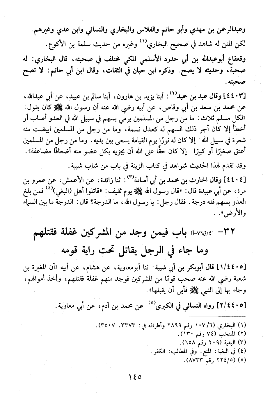 4405 / 1 - قَالَ أَبُو بَكْرِ بْنُ أَبِي شَيْبَةَ: ثَنَا أَبُو مُعَاوِيَةَ، عَنْ هِشَامٍ، عَنْ أَبِيهِ "أَنَّ الْمُغِيرَةَ بْنَ شُعْبَةَ رَضِيَ اللَّهُ عَنْهُ صَحِبَ قَوْمًا مِنَ الْمُشْرِكِينَ فَوَجَدَ مِنْهُمْ غَفْلَةً فَقَتَلَهُمْ، وَأَخَذَ أَمْوَالَهُمْ، وَجَاءَ بِهَا إِلَى النَّبِيِّ - صلى الله عليه وسلم - فَأَبِي أَنْ يَقْبَلَهَا".