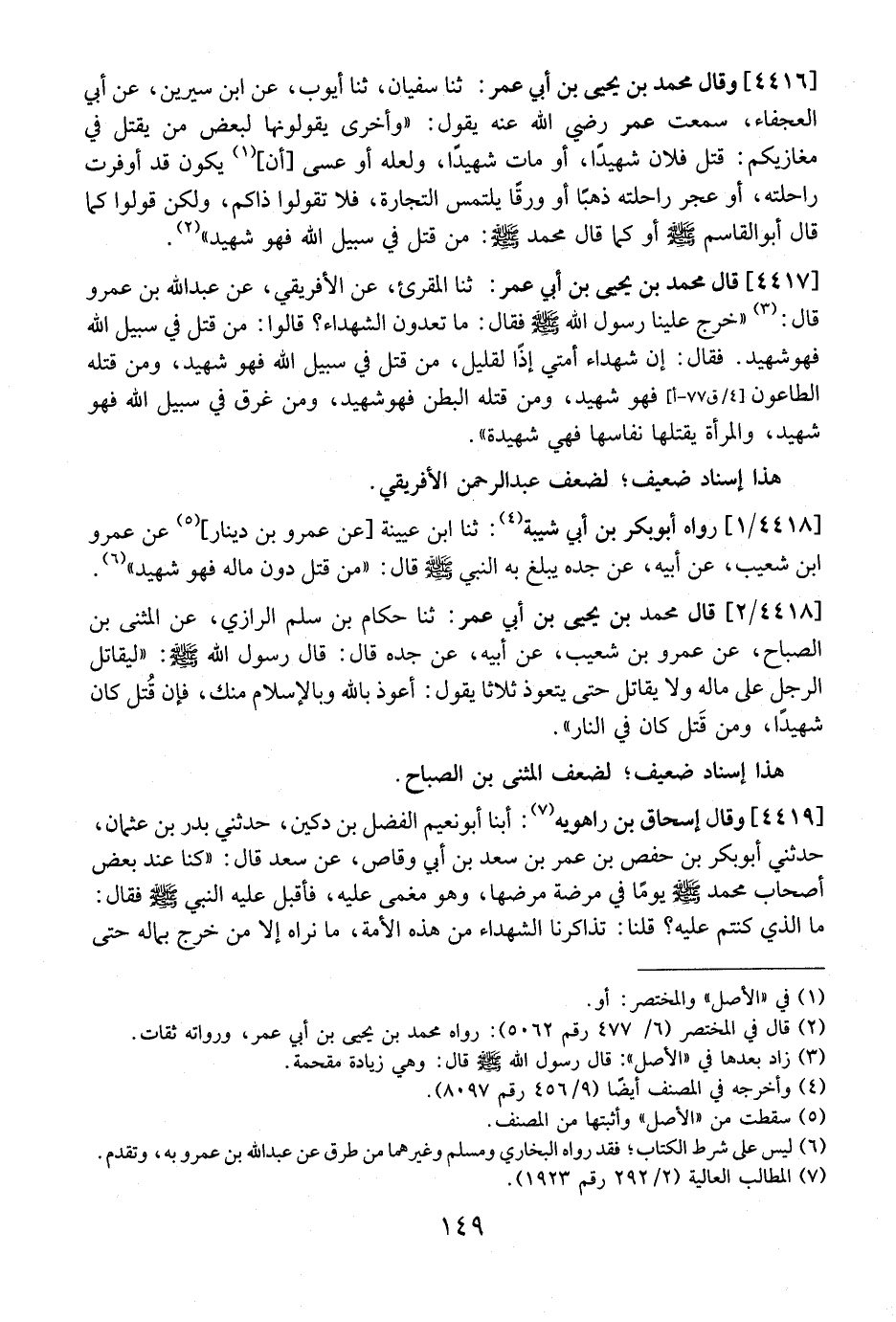 4417 - قَالَ مُحَمَّدُ بْنُ يَحْيَى بْنِ أَبِي عُمَرَ: ثنا الْمُقْرِئُ، عَنِ الْأَفْرِيقِيِّ، عَنْ عَبْدِ اللَّهِ بْنِ عَمْرٍو قَالَ: "خَرَجَ عَلَيْنَا رَسُولُ اللَّهِ - صَلَّى اللَّهُ عَلَيْهِ وَسَلَّمَ - فَقَالَ: مَا تَعُدُّونَ الشُّهَدَاءَ؟ قَالُوا: مَنْ قُتِلَ فِي سَبِيلَ اللَّهِ فَهُوَ شَهِيدٌ. فَقَالَ: إن شُهَدَاءُ أُمَّتِي إِذًا لَقَلِيلُ، مَنْ قُتِلَ فِي سَبِيلَ اللَّهِ فَهُوَ شَهِيدٌ، وَمَنْ قَتَلَهُ الطَّاعُونُ فَهُوَ شَهِيدٌ، وَمَنْ قَتَلَهُ الْبَطْنُ فَهُوَ شَهِيدٌ، وَمَنْ غَرِقَ فِي سَبِيلِ اللَّهِ فَهُوَ شَهِيدٌ، وَالْمَرْأَةُ يَقْتُلُهَا نِفَاسُهَا فَهِيَ شَهِيدَةٌ".