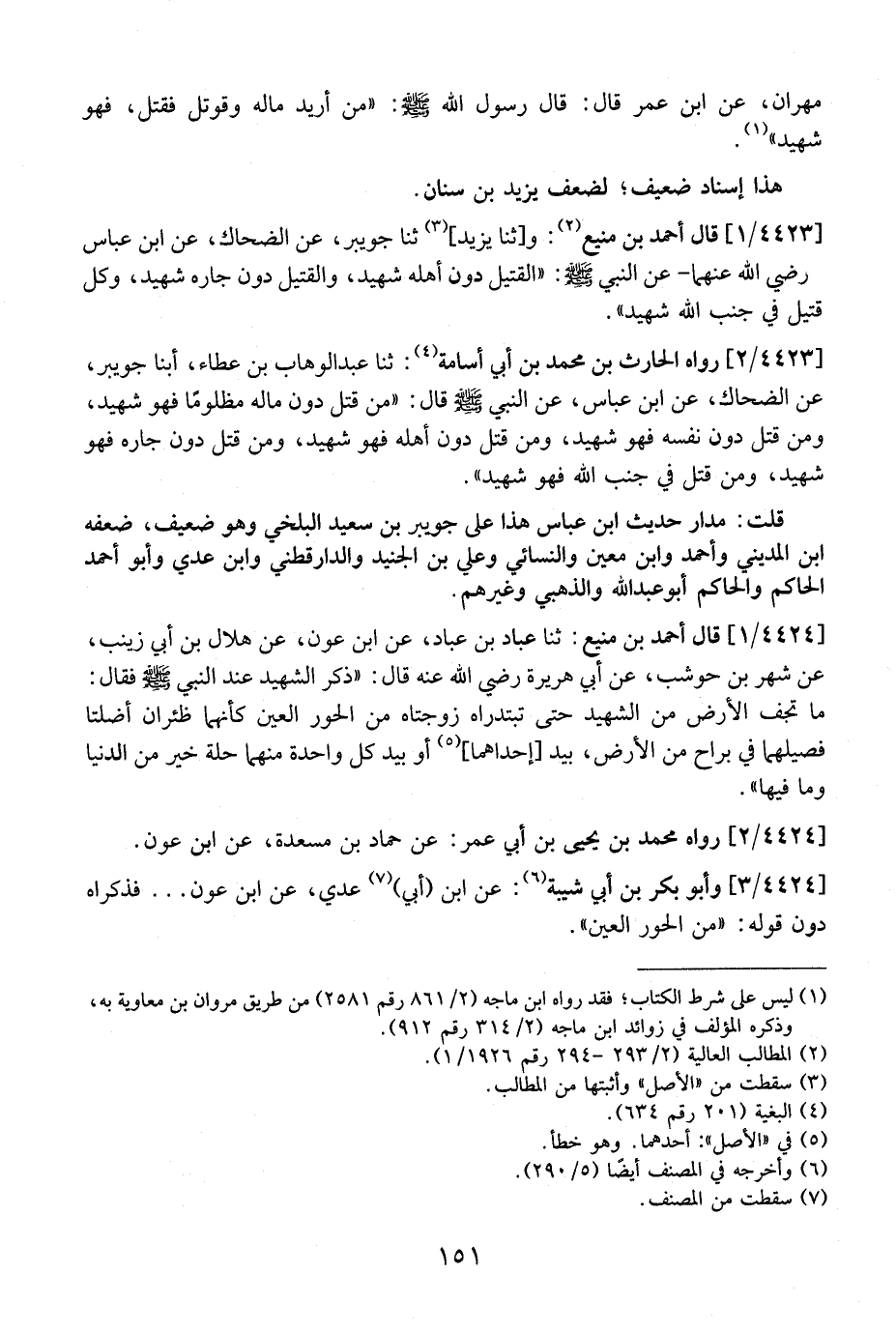 4423 / 1 - قَالَ أَحْمَدُ بن منيع: وأثنا يزيد-، ثنا جُوَيْبِرُ، عَنِ الضَّحَّاكِ، عَنِ ابْنِ عَبَّاسٍ رَضِيَ اللَّهُ عَنْهُمَا- عَنِ النَّبِيِّ - صَلَّى اللَّهُ عَلَيْهِ وَسَلَّمَ -: الْقَتِيلُ دُونَ أَهْلِهِ شَهِيدٌ، وَالْقَتِيلُ دُونَ جَارِهِ شَهِيدٌ، وَكُلُّ قَتِيلٍ فِي جَنْبِ اللَّهِ شَهِيدٌ".
