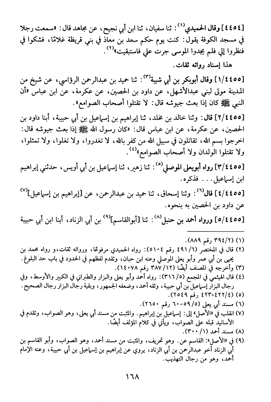 4455 / 1 - وَقَالَ أَبُو بَكْرِ بْنُ أَبِي شَيْبَةَ: ثنا حُمَيْدُ بْنُ عَبْدِ الرَّحْمَنِ الرُّؤَاسِيُّ، عَنْ شَيْخٍ مِنَ الْمَدِينَةِ موَلِي عَبْدِ الْأَشْهَلِ، عَنْ دَاوُدَ بْنِ الْحُصَيْنِ، عَنْ عِكْرِمَةَ، عَنِ ابْنِ عَبَّاسٍ "أَنَّ النَّبِيَّ - صَلَّى اللَّهُ عَلَيْهِ وَسَلَّمَ - كَانَ إِذَا بَعَثَ جُيُوشَهُ قَالَ: لَا تَقْتُلُوا أَصْحَابَ الصَّوَامِعِ ".