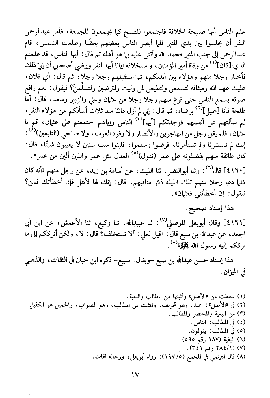 4161 - وَقَالَ أَبُو يَعْلَى الْمَوْصِلِيُّ: ثَنَا عُبَيْدُ اللَّهِ، ثنا وَكِيعٌ، ثنا الْأَعْمَشُ، عَنِ ابْنِ أَبِي الْجَعْدِ، عَنْ عَبْدِ اللَّهِ بْنِ سَبُعٍ قَالَ: "قِيلَ لِعَلِيٍّ: أَلَا تَسْتَخْلِفُ؟ قَالَ: لَا، وَلَكِنْ أَتْرُكُكُمْ إِلَى مَا تَرَكَكُمْ إِلَيْهِ رَسُولُ اللَّهِ - صَلَّى اللَّهُ عَلَيْهِ وَسَلَّمَ -) .