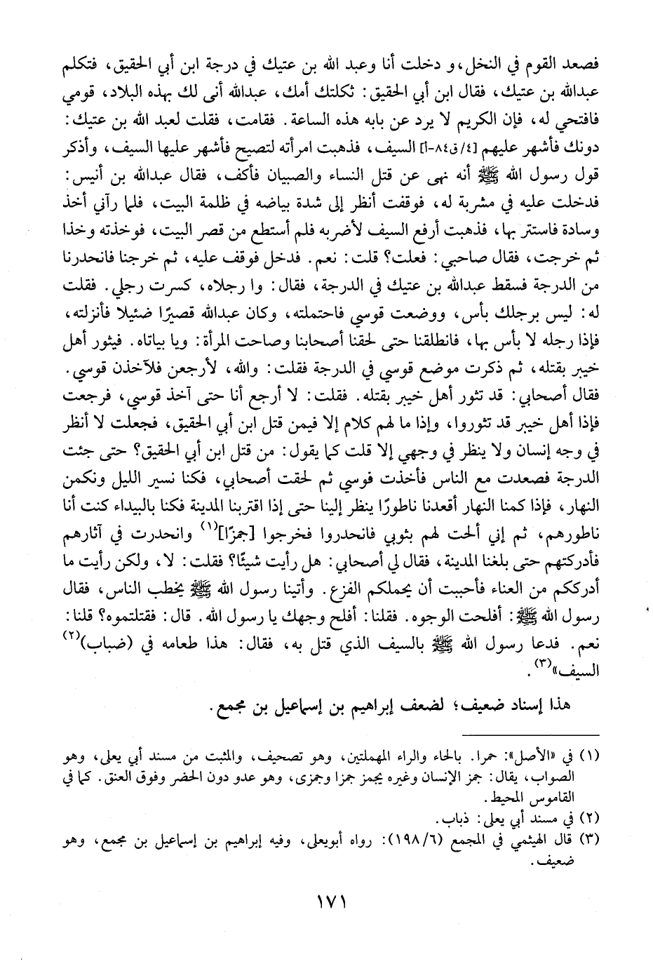 فصعد القوم في النخل، ودخلت أَنَا وَعَبْدُ اللَّهِ بْنُ عَتِيكٍ فِي دَرَجَةِ ابْنِ أَبِي الْحَقِيقِ، فَتَكَلَّمَ عَبْدُ اللَّهِ بْنُ عَتِيكٍ، فَقَالَ ابْنُ أَبِي الْحَقِيقِ: ثَكَلَتْكَ أُمُّكَ، عَبْدَ اللَّهِ أَنَّى لَكَ بِهَذِهِ الْبِلَادِ، قُومِي فَافْتَحِي لَهُ، فَإِنَّ الْكَرِيمَ لَا يُرَدُّ عَنْ بَابِهِ هَذِهِ السَّاعَةَ. فَقَامَتْ، فَقُلْتُ لِعَبْدِ اللَّهِ بْنِ عَتِيكٍ: دُونَكَ فَأَشْهَرَ عَلَيْهِمُ السَّيْفَ، فَذَهَبَتِ امرأته لِتَصِيحَ فَأَشْهَرَ عَلَيْهَا السَّيْفَ، وَأَذْكَرَ قَوْلِ رَسُولِ اللَّهِ - صَلَّى اللَّهُ عَلَيْهِ وَسَلَّمَ - أَنَّهُ نَهَى عَنْ قَتْلِ النِّسَاءِ وَالصِّبْيَانِ فَأَكُفُّ، فَقَالَ عَبْدُ الله بن أنيس: فدخلت عليه في مشربة لَهُ، فَوَقَفْتُ أَنْظُرُ إِلَى شِدَّةِ بَيَاضِهِ فِي ظلمة البيت، فلما رآني أخذ وسادة فاستتر بِهَا، فَذَهَبْتُ أَرْفَعُ السَّيْفَ لِأَضْرِبَهُ فَلَمْ أَسْتَطِعْ من قصر البيت، فوخذته وخذا ثُمَّ خَرَجْتُ، فَقَالَ صَاحِبِي: فَعَلْتُ؟ قُلْتُ: نَعَمْ، فَدَخَلَ فَوَقَفَ عَلَيْهِ، ثُمَّ خَرَجْنَا فَانْحَدَرْنَا مِنَ الدَّرَجَةِ فَسَقَطَ عَبْدُ اللَّهِ بْنُ عَتِيكٍ فِي الدرجة، فقال: وا رجلاه، كُسِرَتْ رِجْلِي. فَقُلْتُ لَهُ: لَيْسَ بِرِجْلِكَ بَأْسٌ، ووضعت قَوْسِي فَاحْتَمَلْتُهُ، وَكَانَ عَبْدُ اللَّهِ قَصِيرًا ضَئِيلًا فَأَنْزَلْتُهُ، فَإِذَا رِجْلُهُ لَا بَأْسَ بِهَا، فَانْطَلَقْنَا حتى لحقنا أصحابنا وصاحت المرأة: ويا بياتاه. فَيَثُورُ أَهْلُ خَيْبَرَ بِقْتَلِهِ، ثُمَّ ذَكَرْتُ مَوْضِعَ قَوْسِي فِي الدَّرَجَةِ فَقُلْتُ: وَاللَّهِ، لَأَرْجِعَنَّ فَلَآخُذَنَّ قوسي. فقال أصحابي: قد تثور أهل خيبر بقتله. فقلت: لا أرجع أَنَا حَتَّى آخُذَ قَوْسِي، فَرَجَعْتُ فَإِذَا أَهْلُ خيبر قد تثوروا، وإذا ما لهم كلام إلا فيمن قَتَلَ ابْنَ أَبِي الْحَقِيقِ، فَجَعَلْتُ لَا أَنْظُرُ فِي وَجْهِ إِنْسَانٍ وَلَا يَنْظُرُ فِي وَجْهِي إلا قلت كما يقوله: مَنْ قَتَلَ ابْنَ أَبِي الْحَقِيقِ؟ حَتَّى جِئْتُ الدَّرَجَةَ فَصَعَدْتُ مَعَ النَّاسِ فَأَخَذْتُ قَوْسِي ثُمَّ لحقت أصحابي، فكنا نسير الليل ونكمن النهار، فَإِذَا كَمَنَّا النَّهَارَ أَقْعَدْنَا نَاطُورًا يَنْظُرُ إِلَيْنَا حَتَّى إِذَا اقْتَرَبْنَا الْمَدِينَةَ فَكُنَّا بِالْبَيْدَاءِ كُنْتُ أَنَا نَاطُورُهُمْ، ثُمَّ إِنِّي أَلَحْتُ لَهُمْ بِثَوْبِي فَانْحَدَرُوا فَخَرَجُوا جمزَا، وَانْحَدَرْتُ فِي آثَارِهِمْ فَأَدْرَكْتُهُمْ حتى بلغنا المدينة، فقال لي أَصْحَابِي: هَلْ رَأَيْتَ شَيْئًا؟ فَقُلْتُ: لَا، وَلَكِنْ رَأَيْتُ مَا أَدْرَكَكُمْ مِنَ الْعَنَاءِ فَأَحْبَبْتُ أَنْ يَحْمِلَكُمُ الْفَزَعُ. وَأَتَيْنَا رَسُولَ اللَّهِ - صَلَّى اللَّهُ عَلَيْهِ وَسَلَّمَ - يَخْطُبُ النَّاسَ، فَقَالَ رَسُولُ اللَّهِ - صَلَّى اللَّهُ عَلَيْهِ وَسَلَّمَ -: أَفْلَحَتِ الْوُجُوهُ. فَقُلْنَا: أَفْلَحَ وَجْهُكَ يَا رَسُولَ اللَّهِ. قَالَ: فَقَتَلْتُمُوهُ؟ قُلْنَا: نَعَمْ. فَدَعَا رَسُولُ اللَّهِ - صَلَّى اللَّهُ عَلَيْهِ وَسَلَّمَ - خَيْرُ بِالسَّيْفِ الَّذِي قُتِلَ بِهِ، فَقَالَ: هَذَا طَعَامُهُ فِي (ضَبَابِ) السَّيْفِ ".