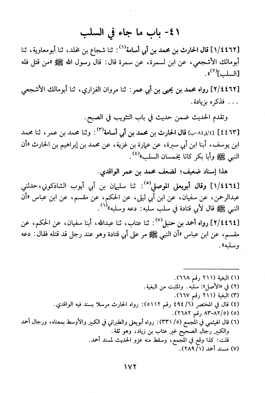 4463 - قَالَ الْحَارِثُ بْنُ مُحَمَّدِ بْنِ أَبِي أُسَامَةَ: وثنا محمد بن عمر، ثنا محمد ابن يوسف، أبنا ابْنُ أَبِي سَبْرَةَ، عَنْ عُمَارَةَ بْنِ غَزِيَّةَ، عَنْ مُحَمَّدِ بْنِ إِبْرَاهِيمَ بْنِ الْحَارِثِ "أَنَّ النبي - صلى الله عليه وسلم - عماله وأبا بكر كَانَا يُخَمِّسَانِ السَّلْبَ ".