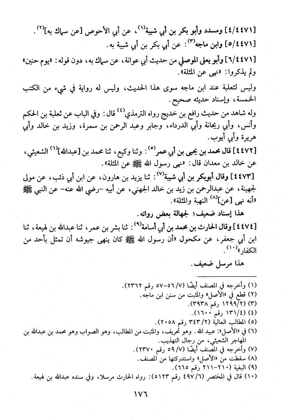 4472 - قَالَ مُحَمَّدُ بْنُ يَحْيَى بْنِ أَبِي عُمَرَ وثنا وكيع، ثنا مُحَمَّدُ بْنُ عَبْدِ اللَّهِ، الشُّعَيْثِيُّ، عَنْ خَالِدِ بْنِ مَعْدَانَ قَالَ: "نَهَى رَسُولُ اللَّهِ - صَلَّى اللَّهُ عَلَيْهِ وسلم - عَنِ الْمَثْلَةِ".