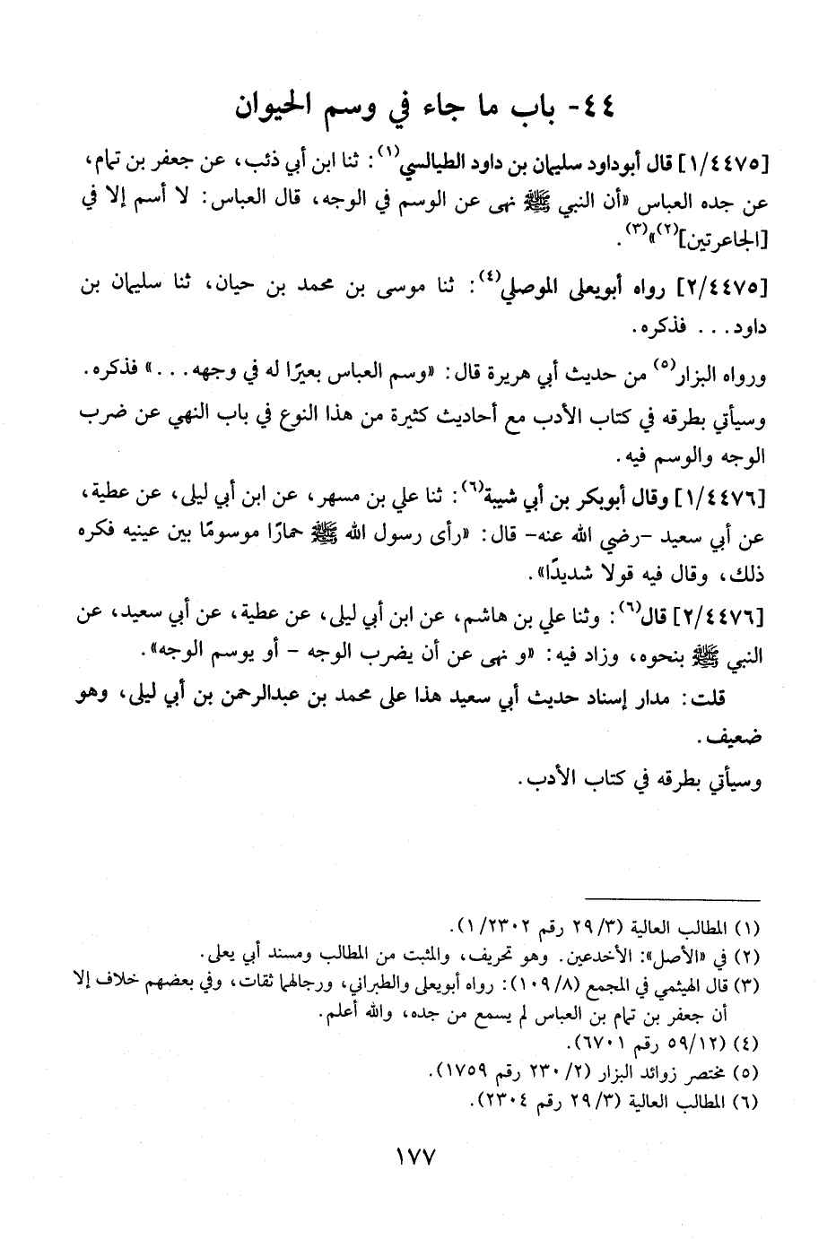 4476 / 1 - وَقَالَ أَبُو بَكْرِ بْنُ أَبِي شَيْبَةَ: ثنا عَلِيُّ بْنُ مِسْهَرٍ، عَنِ ابْنُ أَبِي لَيْلَى، عَنْ عَطِيَّةَ، عَنْ أَبِي سَعِيدٍ- رَضِيَ اللَّهُ عَنْهُ- قَالَ: "رَأَى رَسُولُ اللَّهِ - صَلَّى اللَّهُ عَلَيْهِ وَسَلَّمَ - حِمَارًا مَوْسُومًا بَيْنَ عَيَنَيْهِ فَكَرِهَ ذَلِكَ، وَقَالَ فِيهِ قَوْلًا شَدِيدًا".
