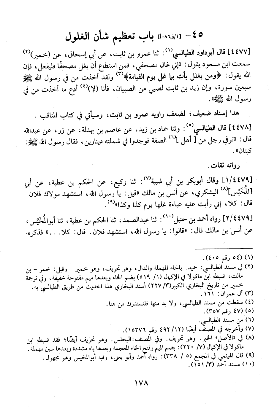 4477 - قَالَ أَبُو دَاوُدَ الطَّيَالِسِيُّ: ثنا عَمْرُو بْنُ ثَابِتٍ، عَنْ أَبِي إِسْحَاقَ، عَنْ (خُمَيْرٍ) سَمِعْتُ ابْنَ مَسْعُودٍ يَقُولُ: "إِنِّي غَالٍ مُصْحَفِي، فَمَنِ اسْتَطَاعَ أَنْ يَغُلَّ مصحفًا فليفعل، فإن الله يقول: {ومن يغلل يأت بِمَا غَلَّ يَوْمَ الْقِيَامَةِ} وَلَقَدْ أَخَذْتُ مِنْ فِيِّ رَسُولِ اللَّهِ - صَلَّى اللَّهُ عَلَيْهِ وَسَلَّمَ - سَبْعِينَ سُورَةً، وَإِنَّ زَيْدَ بْنِ ثَابِتٍ لَصَبِيٌّ مِنَ الصِّبْيَانِ، فَأَنَا لَا أَدَعُ مَا أَخَذْتُ مِنْ فِيِّ رَسُولِ اللَّهِ - صَلَّى اللَّهُ عَلَيْهِ وسلم -.