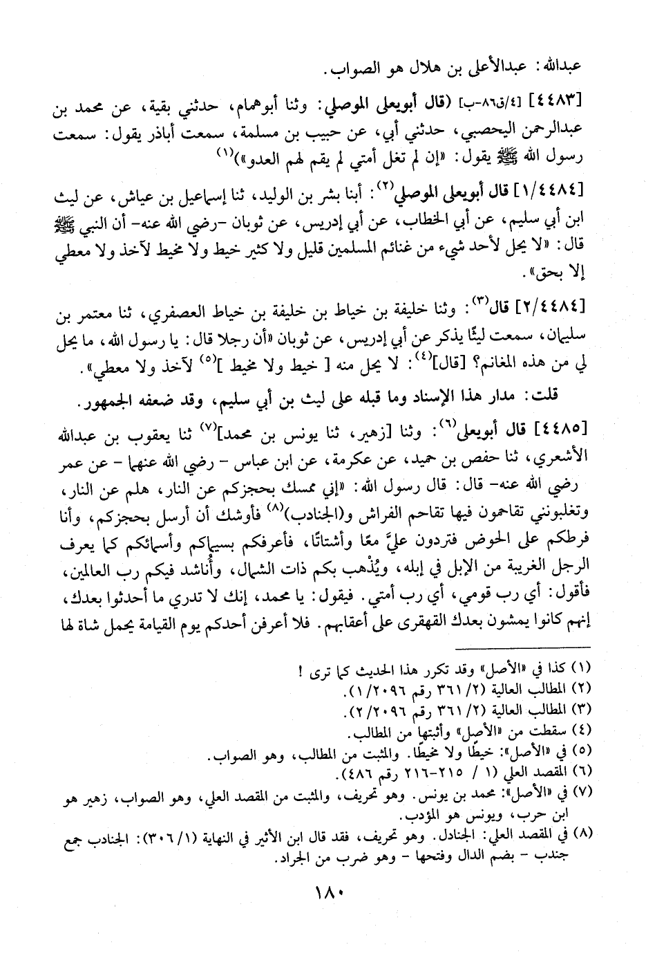 4484 / 1 - قال أبو يعلى الموصلي: أبنا بِشْرُ بْنُ الْوَلِيدِ، ثنا إِسْمَاعِيلُ بْنُ عَيَّاشٍ، عن ليث ابن أَبِي سُلَيْمٍ، عَنْ أَبِي الْخَطَّابِ، عَنْ أَبِي إِدْرِيسَ، عَنْ ثَوْبَانَ- رَضِيَ اللَّهُ عَنْهُ- أَنّ النَّبِيَّ - صَلَّى اللَّهُ عليه وسلم -