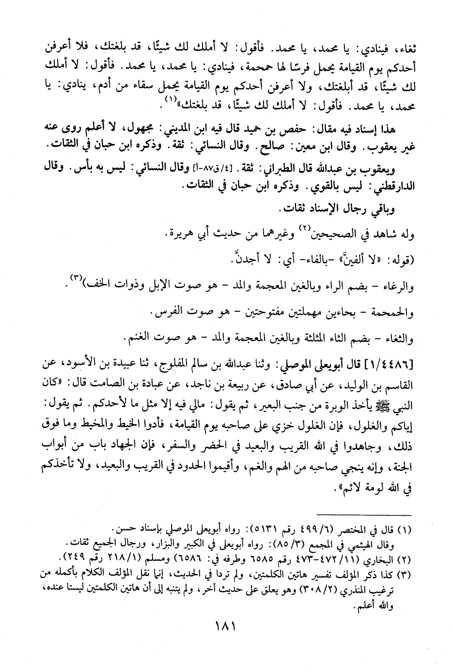 4486 / 1 - قَالَ أَبُو يَعْلَى الْمَوْصِلِيُّ: وَثَنَا عَبْدُ اللَّهِ بْنُ سَالِمٍ الْمَفْلُوجُ، ثنا عُبَيْدَةُ بْنُ الْأَسْوَدِ، عَنِ الْقَاسِمِ بْنِ الْوَلِيدِ، عَنْ أبي صادق، عن ربيعة بن ناجد، عَنْ عُبَادَةَ بْنِ الصَّامِتِ قَالَ: "كَانَ النَّبِيُّ - صَلَّى اللَّهُ عَلَيْهِ وَسَلَّمَ - يَأْخُذُ الْوَبَرَةَ مِنْ جَنْبِ الْبَعِيرِ، ثُمَّ يَقُولُ: مَالِي فِيهِ إِلَّا مثل ما لأحدكم. ثم يقوله: إِيَّاكُمْ وَالْغُلُولَ، فَإِنَّ الْغُلُولَ خِزْيٌ عَلَى صَاحِبِهِ يَوْمَ الْقِيَامَةِ، فَأَدُّوا الْخَيْطَ وَالْمِخْيَطَ وَمَا فَوْقَ ذَلِكَ، وَجَاهِدُوا فِي اللَّهِ الْقَرِيبَ وَالْبَعِيدَ فِي الْحَضَرِ وَالسَّفَرِ، فَإِنَّ الْجِهَادَ بَابٌ مِنْ أَبْوَابِ الْجَنَّةِ، وَإِنَّهُ يُنْجِي صَاحِبَهُ مِنَ الْهَمِّ وَالْغَمِّ، وَأَقِيمُوا الْحُدُودَ فِي الْقَرِيبِ وَالْبَعِيدِ، وَلَا تَأْخُذُكُمْ فِي اللَّهِ لَوْمَةَ لَائِمٍ ".