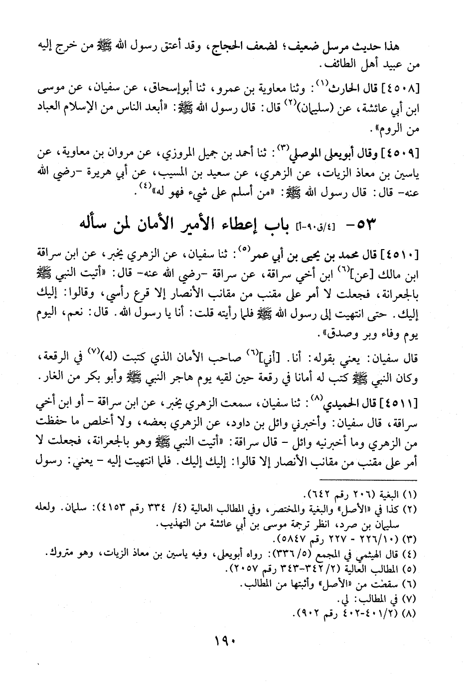 4510 - قَالَ مُحَمَّدُ بْنُ يَحْيَى بْنِ أَبِي عُمَرَ: ثنا سُفْيَانُ، عَنِ الزُّهْرِيِّ يُخْبِرُ، عن ابن سراقة ابن مالك عن، ابْنِ أَخِي سُرَاقَةَ، عَنْ سُرَاقَةَ- رَضِيَ اللَّهُ عَنْهُ- قَالَ: "أَتَيْتُ النَّبِيَّ - صَلَّى اللَّهُ عَلَيْهِ وَسَلَّمَ - بِالْجُعْرَانَةِ، فَجَعَلْتُ لَا أَمُرُّ عَلَى مَقْنَبٍ مِنْ مَقَانِبِ الْأَنْصَارِ إِلَّا قَرَّعَ رَأْسِي، وَقَالُوا: إِلَيْكَ إِلَيْكَ. حَتَّى انْتَهَيْتُ إِلَى رَسُولِ اللَّهِ - صَلَّى اللَّهُ عَلَيْهِ وَسَلَّمَ - فَلَمَّا رَأَيْتُهُ قُلْتُ: أَنَا يَا رَسُولَ اللَّهِ. قَالَ: نِعْمَ، الْيَوْمُ يَوْمُ وَفَاءٍ وَبِرٍّ وَصِدْقٍ ".