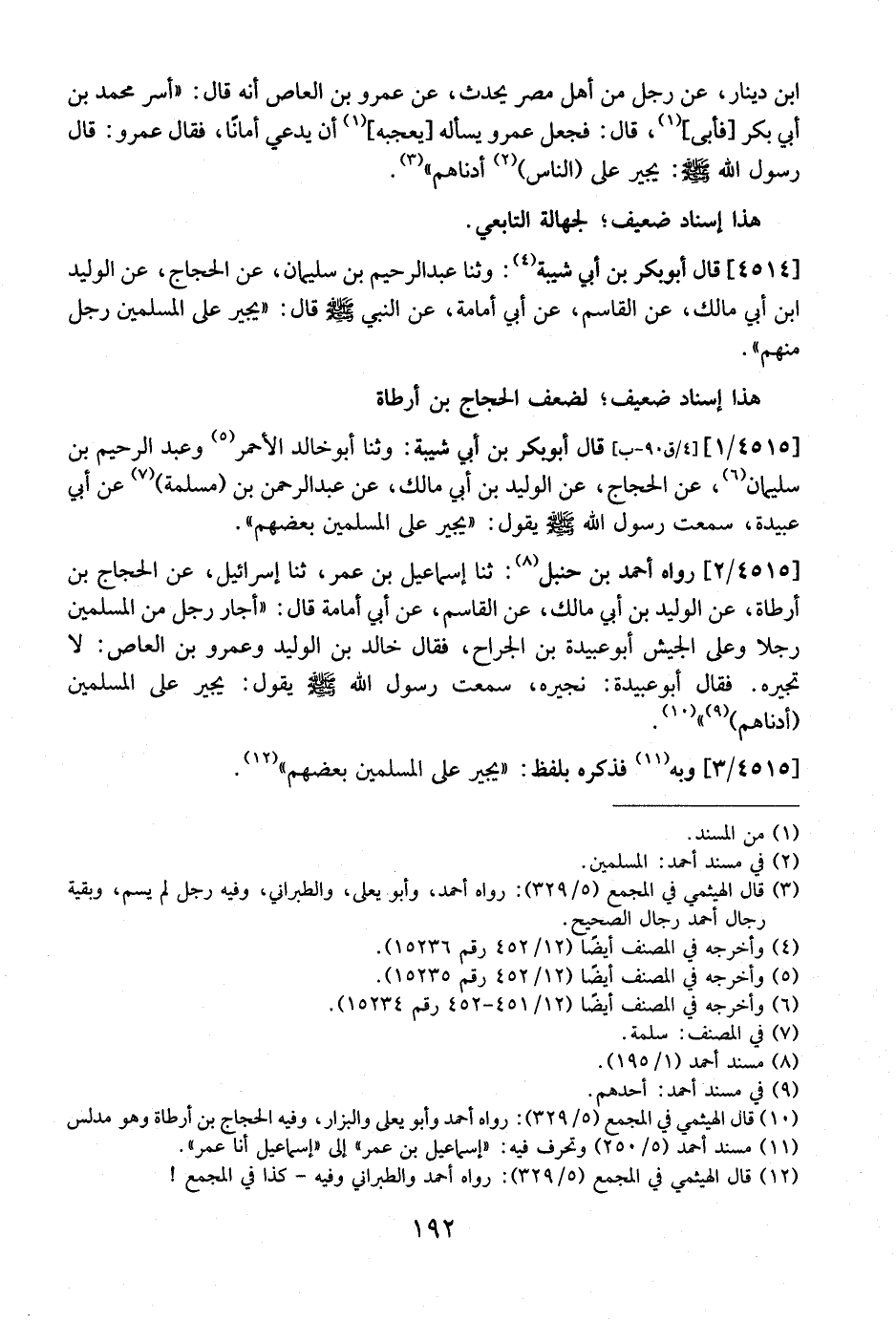 4515 / 1 - قَالَ أَبُو بَكْرِ بْنُ أَبِي شَيْبَةَ: وَثَنَا أَبُو خَالِدٍ الْأَحْمَرُ وَعَبْدُ الرَّحِيمِ بْنُ سُلَيْمَانَ، عَنِ الْحَجَّاجِ، عَنِ الْوَلِيدِ بْنِ أَبِي مَالِكٍ، عَنْ عَبْدِ الرَّحْمَنِ بْنِ (مَسْلَمَةَ) عَنْ أَبِي عُبَيْدَةَ، سَمِعْتُ رسول الله - صلى الله عليه وسلم - يقول: "يُجِيرُ عَلَى الْمُسْلِمِينَ بَعْضُهُمْ ".