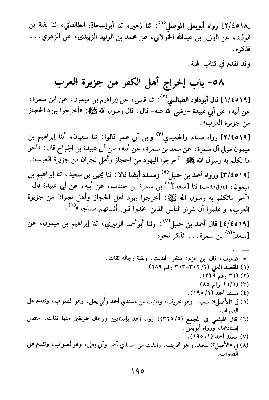 4519 / 3 - وَرَوَاهُ أَحْمَدُ بْنُ حَنْبَلٍ وَمُسَدَّدٌ أَيْضًا قَالَا: ثَنَا يَحْيَى بْنُ سَعِيدٍ، ثَنَا إِبْرَاهِيمُ بْنُ ميمون، ثنا سَعْدُ بْنُ سَمُرَةَ بْنِ جُنْدُبٍ، عَنْ أَبِيهِ، عَنْ أَبِي عُبَيْدَةَ قَالَ: "آخِرَ مَا تَكَلَّمَ بِهِ رَسُولُ اللَّهِ - صَلَّى اللَّهُ عَلَيْهِ وَسَلَّمَ -: أَخْرِجُوا يَهُودَ أَهْلِ الْحِجَازِ وَأَهْلِ نَجْرَانَ مِنْ جَزِيرَةِ الْعَرَبِ، وَاعْلَمُوا أَنَّ شِرَارَ النَّاسِ الَّذِينَ اتَّخَذُوا قُبُورَ أَنْبِيَائِهِمْ مَسَاجِدَ".