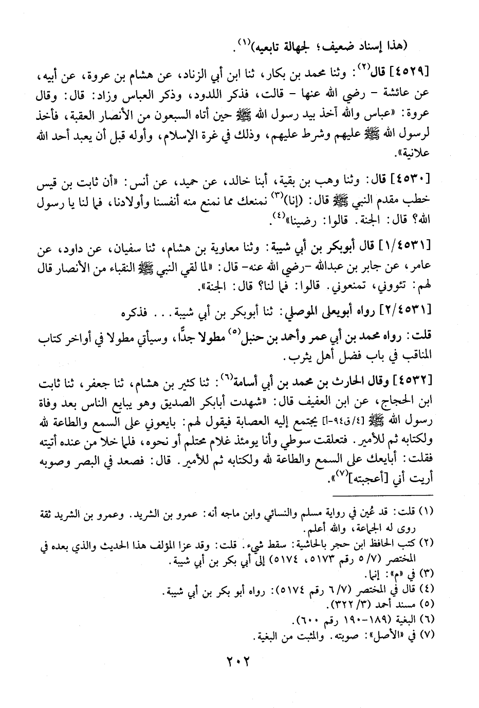 4531 / 1 - قَالَ أَبُو بَكْرِ بْنُ أَبِي شَيْبَةَ: وَثَنَا مُعَاوِيَةُ بْنُ هِشَامٍ، ثنا سُفْيَانُ، عَنْ دَاوُدَ، عَنْ عَامِرٍ، عَنْ جَابِرِ بْنِ عَبْدِ اللَّهِ- رَضِيَ اللَّهُ عَنْهُ- قَالَ: "لَمَّا لَقِيَ النَّبِيُّ - صَلَّى اللَّهُ عَلَيْهِ وَسَلَّمَ - النُّقَبَاءَ من الأنصار قال لهم: تمنعوني، تمنعوني. قالوا: فما لنا؟ قال: الْجَنَّةَ".
