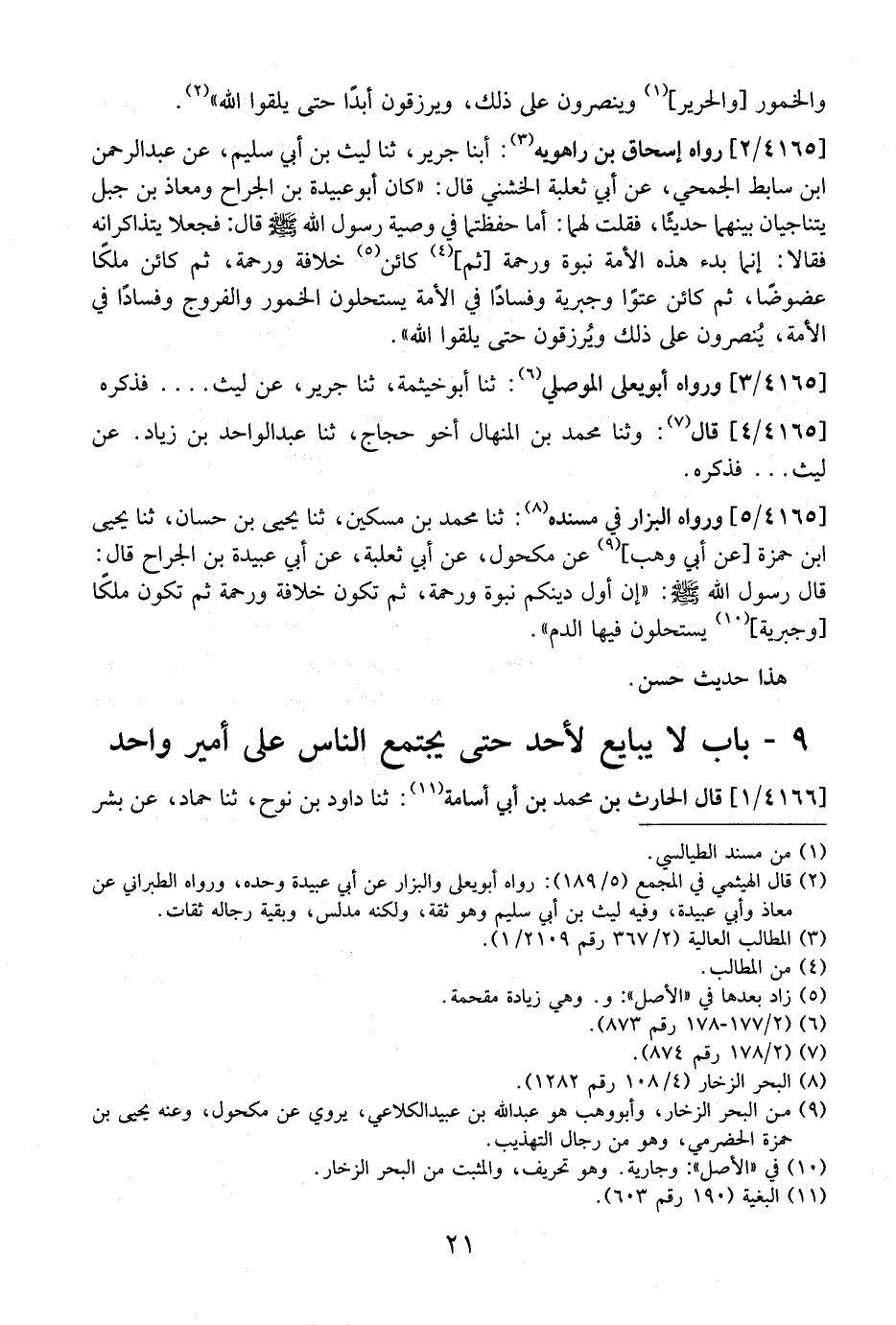 4165 / 2 - رواه إسحاق بن راهويه: أبنا جَرِيرٌ، ثنا لَيْثِ بْنِ أَبِي سُلَيْمٍ، عَنْ عَبْدِ الرَّحْمَنِ ابن سَابِطٍ الْجُمَحِيِّ، عَنْ أَبِي ثَعْلَبَةَ الْخُشَنِيِّ قَالَ: "كَانَ أَبُو عُبَيْدَةَ بْنُ الْجَرَّاحِ وَمُعَاذُ بْنُ جَبَلٍ يَتَنَاجَيَانِ بَيْنَهُمَا حَدِيثًا، فَقُلْتُ لَهُمَا: أَمَا حَفِظْتُمَا فِي وَصِيَّةَ رَسُولِ اللَّهِ - صَلَّى اللَّهُ عَلَيْهِ وَسَلَّمَ - قَالَ: فَجَعَلَا يَتَذَاكَرَانِهِ فَقَالَا: إِنَّمَا بدء هذه الأمة نبوة ورحمة ثم كائن النبي - صلى الله عليه وسلم - خلافة ورحمة، ثم كَائِنٌ مُلْكًا عَضُوضًا، ثُمَّ كَائِنٌ عُتُوًّا وَجَبْرِيَّةً وَفَسَادًا فِي الْأُمَّةِ يَسْتَحِلُّونَ الْخُمُورَ وَالْفُرُوجَ وَفَسَادًا فِي الْأُمَّةِ، يُنصرون عَلَى ذَلِكَ ويُرزقون حَتَّى يَلْقَوُا اللَّهَ ".