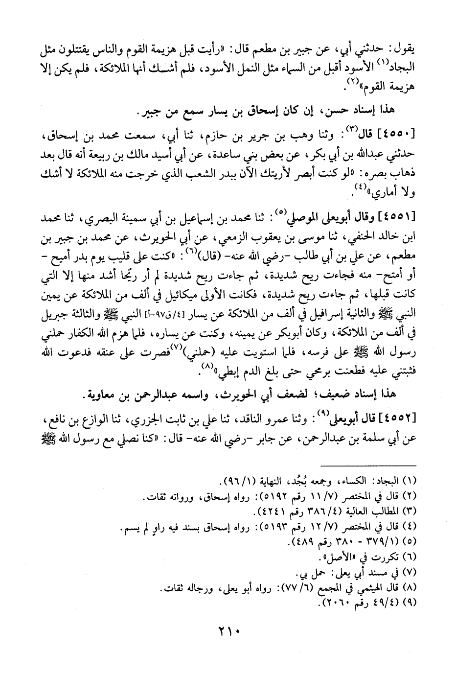 4551 - وَقَالَ أَبُو يَعْلَى الْمَوْصِلِيُّ ثَنَا مُحَمَّدُ بْنُ إسماعيل بن أبي سمينة البصري، ثنا محمد ابن خَالِدٍ الْحَنَفِيُّ، ثنا مُوسَى بْنُ يَعْقُوبَ الزَّمْعِيُّ، عن أبي الْحُوَيْرِثِ، عَنْ مُحَمَّدِ بْنِ جُبَيْرِ بْنِ مُطْعَمٍ، عَنْ عَلِيِّ بْنِ أَبِي طَالِبٍ- رَضِيَ اللَّهُ عَنْهُ- (قَالَ) : "كُنْتُ عَلَى قَلِيبِ يَوْمِ بَدْرٍ أَمِيحُ- أَوْ أَمْتَحُ- مِنْهُ فَجَاءَتْ رِيحٌ شَدِيدَةٌ، ثُمَّ جَاءَتْ رِيحٌ شَدِيدَةٌ لَمْ أَرَ رِيحًا أَشَدَّ مِنْهَا إِلَّا الَّتِي كَانَتْ قَبْلَهَا، ثُمَّ جَاءَتْ رِيحٌ شَدِيدَةٌ، فَكَانَتِ الْأُولَى مِيكَائِيلَ فِي أَلْفٍ مِنَ الْمَلَائِكَةِ عَنْ يَمِينِ النَّبِيِّ - صَلَّى اللَّهُ عَلَيْهِ وَسَلَّمَ - وَالثَّانِيَةُ إِسْرَافِيلَ فِي أَلْفٍ مِنَ الْمَلَائِكَةِ عَنْ يَسَارِ النَّبِيِّ - صَلَّى اللَّهُ عَلَيْهِ وَسَلَّمَ - وَالثَّالِثَةُ جِبْرِيلَ فِي أَلْفٍ مِنَ الْمَلَائِكَةِ، وَكَانَ أَبُو بَكْرٍ عَنْ يَمِينِهِ، وَكُنْتُ عَنْ يَسَارِهِ، فَلَمَّا هَزَمَ اللَّهُ الْكُفَّارَ حَمَلَنِي رَسُولُ اللَّهِ - صَلَّى اللَّهُ عَلَيْهِ وَسَلَّمَ - عَلَى فَرَسَهِ، فَلَمَّا اسْتَوَيْتُ عَلَيْهِ (حَمَلَنِي) فَصِرْتُ عَلَى عُنُقِهِ فَدَعَوْتُ اللَّهَ فَثَبَّتَنِي عَلَيْهِ فَطَعَنْتُ بِرُمْحِي حَتَّى بَلَغَ الدَّمُ إبطي ".