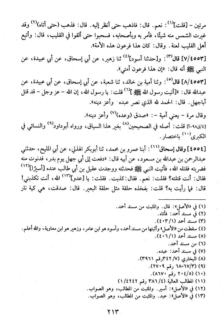 4554 - وقال إسحاق: أبنا عَمْرُو بْنُ مُحَمَّدٍ، ثنا أَبُو بَكْرٍ الْهُذَلِيُّ، عن أبي المليح، حدثني عبد الرحم بْنُ عَبْدِ اللَّهِ بْنِ مَسْعُودٍ، عَنْ أَبِيهِ قَالَ: "دَفَعْتُ إِلَى أَبِي جَهْلٍ يَوْمَ بَدْرٍ، دنوت مِنْهُ فَضَرَبْتُهُ فَقَتَلَهُ اللَّهُ، فَأَتَيْتُ النَّبِيُّ - صَلَّى اللَّهُ عَلَيْهِ وَسَلَّمَ - فَحَدَّثْتُهُ وَوَجَدْتُ عُقَيْلَ بْنَ أَبِي طَالِبٍ عِنْدَهُ أَسِيرًا، فَقَالَ: أَنْتَ قَتَلْتُهُ؟ فقلت: نعم. فقال: كذبت. فقلت: يا أعدو اللَّهِ، أَنْتَ تُكَذِّبُنِي! قَالَ: فَمَا رَأَيْتَ بِهِ؟ قُلْتُ: بِفَخْذِهِ حَلَقَةٌ مِثْلُ حَلَقَةِ الْبَعِيرِ. قَالَ: صَدَقْتَ، هِيَ كَيَّةُ نَارٍ