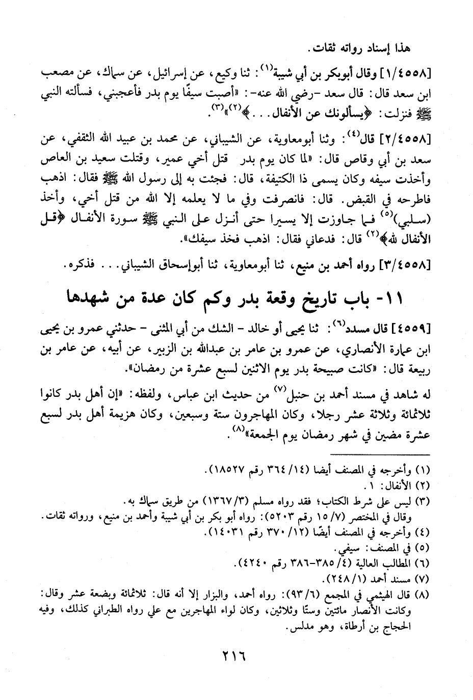 4558 / 2 - قَالَ: وثنا أَبُو مُعَاوِيَةَ، عَنِ الشَّيْبَانِيِّ، عَنْ مُحَمَّدِ بْنِ عُبَيْدِ اللَّهِ الثَّقَفِيِّ، عَنْ سَعْدِ بْنِ أَبِي وَقَّاصٍ قَالَ: "لَمَّا كَانَ يَوْمُ بَدْرٍ قُتِلَ أَخِي عُمَيْرٍ، وَقَتَلْتُ سَعِيدَ بْنَ الْعَاصِ وَأَخَذْتُ سَيْفَهُ وَكَانَ يُسَمَّى ذَا الكتيفة، قَالَ: فَجِئْتُ بِهِ إِلَى رَسُولِ اللَّهِ - صَلَّى اللَّهُ عَلَيْهِ وَسَلَّمَ - فَقَالَ: اذْهَبْ فَاطْرَحْهُ فِي الْقَبْضِ. قَالَ: فَانْصَرَفْتُ وَفِيَّ مَا لَا يَعْلَمُهُ إِلَّا اللَّهُ مِنْ قَتْلِ أَخِي، وَأَخْذِ (سَلْبِي) فَمَا جَاوَزْتُ إِلَّا يَسِيرًا حَتَّى أنْزِلَ عَلَى النَّبِيِّ - صَلَّى اللَّهُ عَلَيْهِ وَسَلَّمَ - سُورَةُ الْأَنْفَالِ {قل الأنفال لله} قال: فدعاني فقال: اذهب فخذ سيفك ".