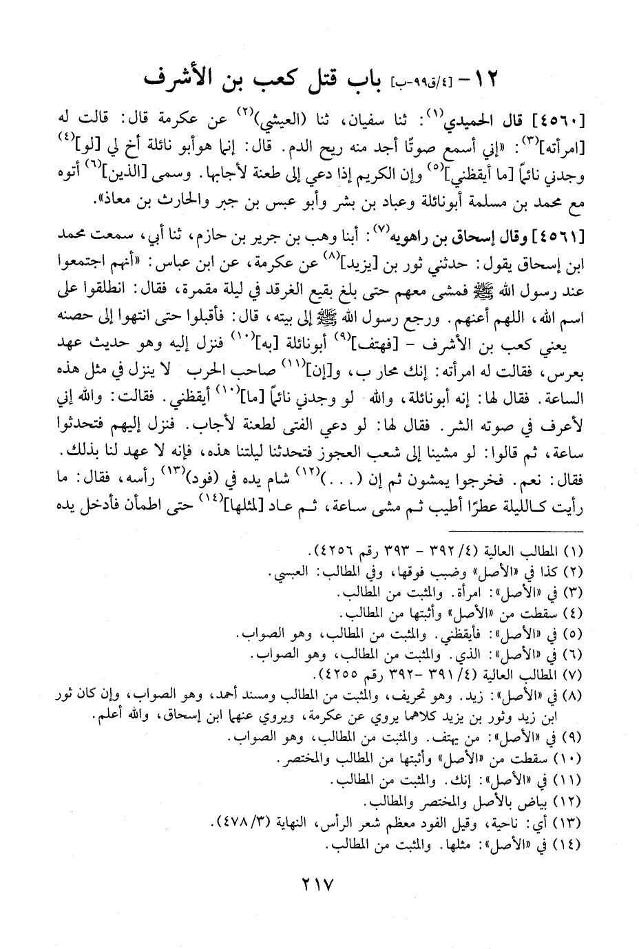 4561 - وَقَالَ إِسْحَاقُ بْنُ رَاهَوَيْهِ: أبنا وَهْبُ بْنُ جَرِيرِ بْنِ حَازِمٍ، ثَنَا أَبِي، سمعت محمد ابن إسحاق يقول: حدثني ثَوْرِ بْنِ يَزِيدَ، عَنْ عِكْرِمَةَ، عَنِ ابْنِ عَبَّاسٍ: "أَنَّهُمُ اجْتَمَعُوا عِنْدَ رَسُولِ اللَّهِ - صَلَّى اللَّهُ عَلَيْهِ وَسَلَّمَ - فَمَشَى مَعَهُمْ حَتَّى بَلَغَ بَقِيعَ الْغَرْقَدِ فِي لَيْلَةٍ مُقْمِرَةٍ، فَقَالَ: انْطَلِقُوا عَلَى اسْمِ اللَّهِ، اللَّهُمَّ أَعِنْهُمْ. وَرَجَعَ رَسُولُ اللَّهِ - صَلَّى اللَّهُ عَلَيْهِ وَسَلَّمَ - إِلَى بَيْتِهِ، قَالَ: فَأَقْبَلُوا حَتَّى انتهوا إلى حصنه يعني كب بن الأشرف- فهتف أبو نائلة به فَنَزَلَ إِلَيْهِ وَهُوَ حَدِيثُ عَهْدٍ بِعُرْسٍ، فَقَالَتْ له امرأته: إنك محارب، وإن صاحب الحرب لا ينزل في مثل هذه الساعة. فقال لها: إنه أبو نائلة، والله لو وجدني نائماً ما أيقظني. فقال: وَاللَّهِ إِنِّي لَأَعْرِفُ فِي صَوْتِهِ الشَّرَّ. فَقَالَ لَهَا: لَوْ دُعِيَ الْفَتَى لِطَعْنَةٍ لَأَجَابَ. فَنَزَلَ إليهم فتحدثوا ساعة، ثم قالوا: لو مشينا إِلَى شُعَبِ الْعَجُوزِ فَتَحدثنا لَيْلَتَنَا هَذِهِ، فَإِنَّهُ لَا عَهْدَ لَنَا بِذَلِكَ. فَقَالَ: نَعَمْ. فَخَرَجُوا يمشون ثم إن ... شام يده في (فود) رَأْسِهِ، فَقَالَ: مَا رَأَيْتُ كَاللَّيْلَةِ عِطْرًا أَطْيَبَ ثم مشى ساعة، ثم عاد لمثلها، حَتَّى اطْمَأَنَّ فَأَدْخَلَ يَدَهُ
