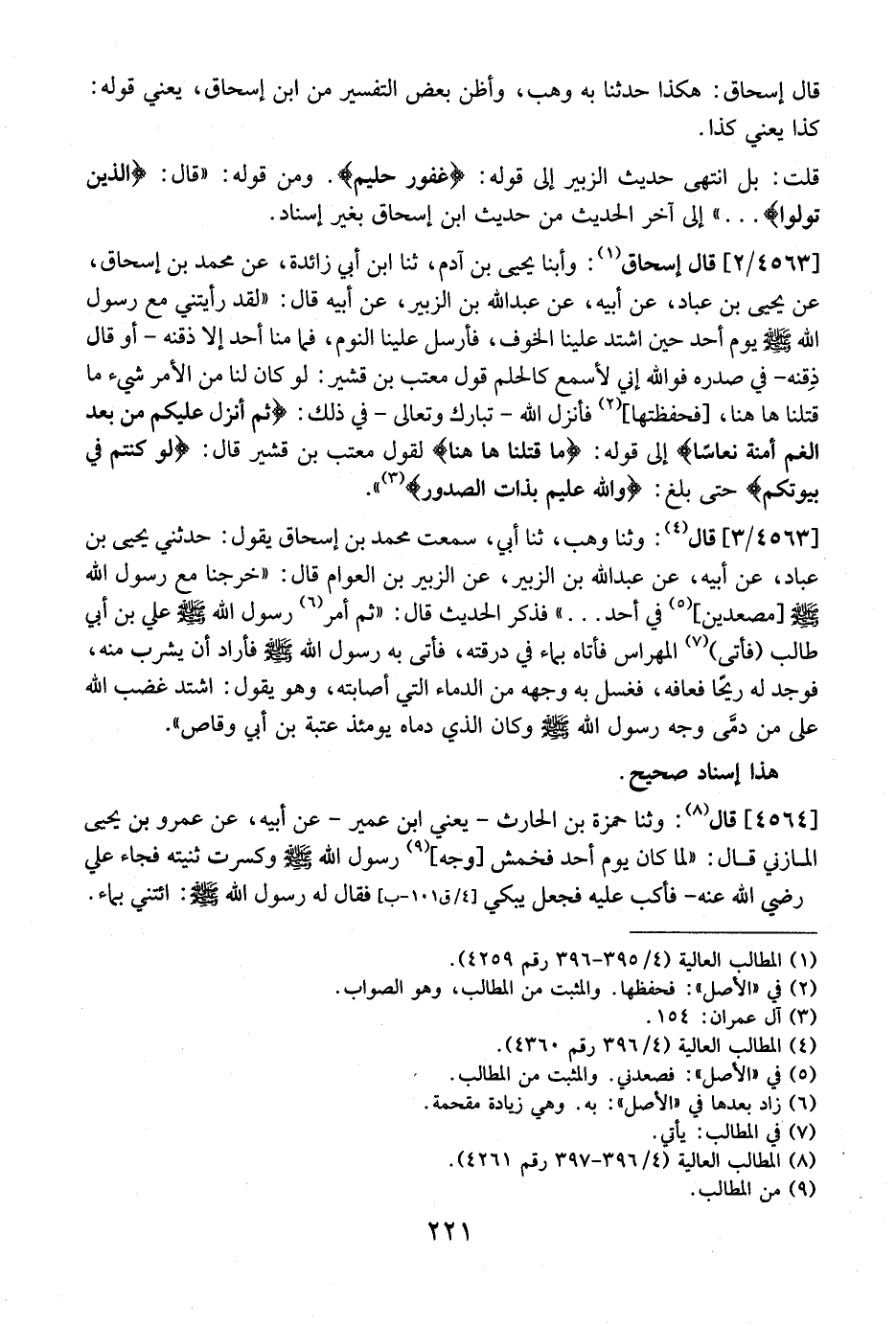4563 / 3 - قَالَ: وثنا وَهْبٌ، ثنا أَبِي، سَمِعْتُ مُحَمَّدَ بْنَ إِسْحَاقَ يَقُولُ: حَدَّثَنِي يَحْيَى بْنُ عَبَّادٍ، عَنْ أَبِيهِ، عَنْ عَبْدِ اللَّهِ بْنِ الزُّبَيْرِ، عَنِ الزُّبَيْرِ بْنِ الْعَوَّامِ قَالَ: "خَرَجْنَا مَعَ رَسُولِ اللَّهِ - صَلَّى اللَّهُ عَلَيْهِ وَسَلَّمَ - مصعدين فِي أُحُدٍ ... " فَذَكَرَ الْحَدِيثَ قَالَ: "ثُمَّ أَمْرِ رَسُولِ اللَّهِ - صَلَّى اللَّهُ عَلَيْهِ وَسَلَّمَ - على بْنَ أَبِي طَالِبٍ (فَأَتَى) الْمِهْرَاسَ فَأَتَاهُ بِمَاءٍ فِي دَرَقَتِهِ، فَأَتَى بِهِ رَسُولُ اللَّهِ - صَلَّى اللَّهُ عَلَيْهِ وَسَلَّمَ - فَأَرَادَ أَنْ يَشْرَبَ مِنْهُ، فَوَجَدَ لَهُ رِيحًا فَعَافَهُ، فَغَسَلَ بِهِ وَجْهَهُ مِنَ الدِّمَاءِ الَّتِي أَصَابَتْهُ، وَهُوَ يَقُولُ: اشَّتَدَ غَضَبُ اللَّهِ عَلَى مَنْ دمَّى وَجْهَ رَسُولِ اللَّهِ - صَلَّى اللَّهُ عَلَيْهِ وَسَلَّمَ - وَكَانَ الَّذِي دَمَّاهُ يَوْمَئِذٍ عُتْبَةُ بْنُ أَبِي وَقَّاصٍ ".