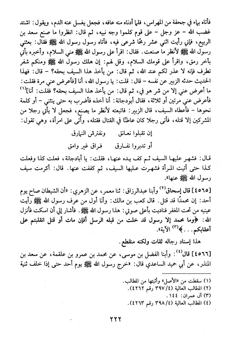 4565 - قال إسحاق وأبنا عَبْدُ الرَّزَّاقِ: ثنا مَعْمَرٌ، عَنِ الزُّهْرِيِّ: "أَنَّ الشَّيْطَانَ صَاحَ يَوْمَ أُحُدٍ: أَنَّ مُحَمَّدًا قَدْ قُتِلَ. قَالَ كَعْبُ بْنُ مَالِكٍ: وَأَنَا أَوَّلُ مَنْ عَرَفَ رَسُولَ اللَّهِ - صَلَّى اللَّهُ عَلَيْهِ وَسَلَّمَ - رَأَيْتُ عَيْنَيْهِ مِنْ تَحْتِ الْمِغْفَرِ فَنَادَيْتُ بِأَعْلَى صَوْتِي: هَذَا رَسُولُ اللَّهِ - صَلَّى اللَّهُ عَلَيْهِ وَسَلَّمَ -. فَأَشَارَ إِلَيَّ أَنِ اسْكُتْ فَأَنْزَلَ اللَّهُ: {وَمَا مُحَمَّدٌ إِلا رَسُولٌ قَدْ خَلَتْ مِنْ قَبْلِهِ الرُّسُلُ أَفَإِنْ مَاتَ أَوْ قُتِلَ انقلبتم على أعقا بكم ... } لآية ".