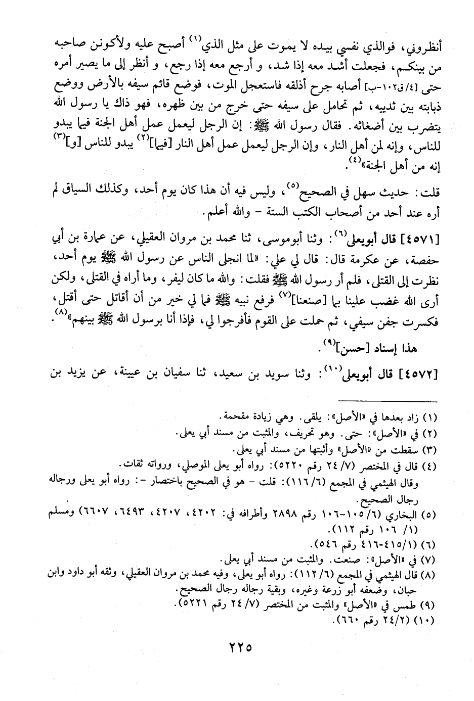 4571 - قَالَ أَبُو يَعْلَى: وثنا أَبُو مُوسَى، ثنا مُحَمَّدُ بْنُ مَرْوَانَ الْعُقَيْلِيُّ، عَنْ عُمَارَةَ بْنِ أَبِي حَفْصَةَ، عَنْ عِكْرِمَةَ قَالَ: قَالَ لِي عَلِيٌّ: "لَمَّا انْجَلَى النَّاسُ عَنْ رَسُولِ اللَّهِ - صَلَّى اللَّهُ عَلَيْهِ وَسَلَّمَ - يوم أحد، ظرت إِلَى الْقَتْلَى، فَلَمْ أَرَ رَسُولَ اللَّهِ - صَلَّى اللَّهُ عَلَيْهِ وَسَلَّمَ - فَقُلْتُ: وَاللَّهِ مَا كَانَ لِيَفِرَّ، وَمَا أَرَاهُ فِي الْقَتْلَى، وَلَكِنْ أَرَى اللَّهَ غَضِبَ عَلَيْنَا بِمَا صَنَعْنَا فَرَفَعَ نَبِيَّهُ - صَلَّى اللَّهُ عَلَيْهِ وَسَلَّمَ - فَمَا لِي خَيْرٌ مِنْ أَنْ أُقَاتِلَ حَتَّى أُقْتَلَ، فَكُسِرَتْ جِفْنُ سَيْفِي، ثُمَّ حَمَلْتُ عَلَى الْقَوْمِ فَأَفْرَجُوا لِي، فَإِذَا أَنَا بِرَسُولِ اللَّهِ - صَلَّى اللَّهُ عَلَيْهِ وسلم - بينهم.