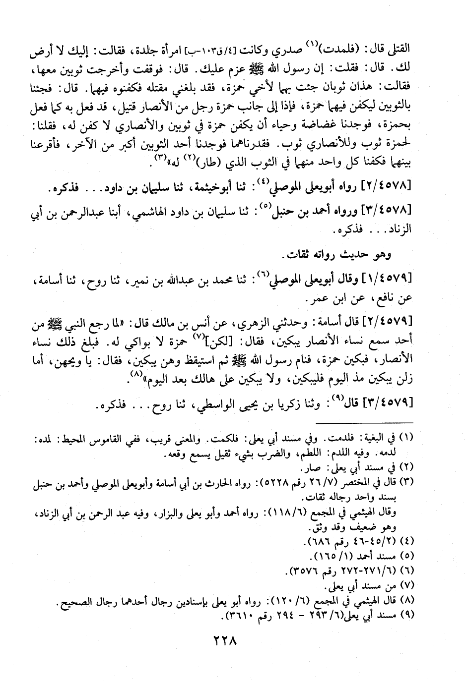 القتلى قال: فلمدت صدري وكانت امرأة جلدة، فقال: إِلَيْكَ لَا أَرْضَ لَكَ. قَالَ: فَقُلْتُ: إِنَّ رَسُولَ اللَّهِ - صَلَّى اللَّهُ عَلَيْهِ وَسَلَّمَ - عَزَمَ عليك. قال: فوقفت وأخرجت ثوبين معها، فقال: هَذَانِ ثَوْبَانِ جِئْتُ بِهِمَا لِأَخِي حَمْزَةَ، فَقَدْ بلغني مقتله فكفنوه فيهما. قال: فجئنا بِالثَّوْبَيْنِ لِيُكَفَّنَ فِيهِمَا حَمْزَةُ، فَإِذَا إِلَى جَانِبِ حَمْزَةَ رَجُلٌ مِنَ الْأَنْصَارِ قَتِيلٌ، قَدْ فُعِلَ به كما فُعِلَ بِحَمْزَةَ، فَوَجَدْنَا غَضَاضَةً وَحَيَاءً أَنْ يُكَفَّنَ حَمْزَةُ فِي ثَوْبَيْنِ وَالْأَنْصَارِيُّ لَا كَفَنَ لَهُ، فَقُلْنَا: لِحَمْزَةَ ثَوْبٌ وَلِلْأَنْصَارِيِّ ثَوْبٌ. فَقَدَّرْنَاهُمَا فَوَجَدْنَا أَحَدَ الثَّوْبَيْنِ أَكْبَرَ مِنَ الاَخر، فَأَقْرَعْنَا بَيْنَهُمَا فكفنا كُلُّ وَاحِدٍ مِنْهُمَا فِي الثَّوْبِ الَّذِي (طَارَ) لَهُ ".