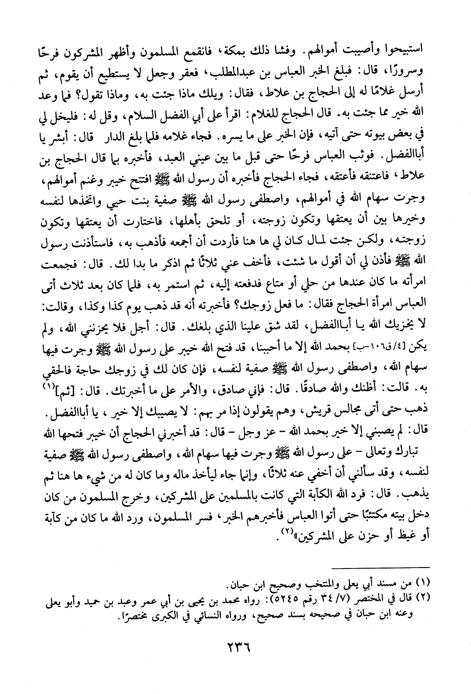 اسْتُبِيحُوا وَأُصِيبَتْ أَمْوَالُهُمْ. وَفَشَا ذَلِكَ بِمَكَّةَ، فَانْقَمَعَ الْمُسْلِمُونَ وَأَظَهْرَ الْمُشْرِكُونَ فَرَحًا وَسُرُورًا، قَالَ: فَبَلَغَ الْخَبَرُ الْعَبَّاسُ بْنُ عَبْدِ الْمُطَّلِبِ، فَعَقَرَ وَجَعَلَ لَا يَسْتَطِيعُ أَنْ يَقُومَ، ثُمَّ أَرْسَلَ غُلَامًا لَهُ إِلَى الْحَجَّاجِ بْنِ عِلَاطٍ، فَقَالَ: وَيْلَكَ مَاذَا جِئْتَ بِهِ، وَمَاذَا تَقُولُ؟ فَمَا وَعَدَ اللَّهُ خَيْرٌ مِمَّا جِئْتَ بِهِ. قَالَ الْحَجَّاجُ لِلْغُلَامِ: اقْرَأْ عَلَى أَبِي الْفَضْلِ السَّلَامَ، وَقُلْ لَهُ: فَلْيَخْلُ لِي فِي بَعْضِ بُيُوتِهِ حَتَّى آتِيَهُ، فَإِنَّ الْخَبَرَ عَلَى مَا يَسُرُّهُ. فَجَاءَ غُلَامُهُ فَلَمَّا بَلَغَ الدَّارَ قَالَ: أَبْشِرْ يَا أَبَا الْفَضْلِ. فَوَثَبَ الْعَبَّاسُ فَرَحًا حَتَّى قَبَّلَ ما بين عيني العبد، فأخبره بها قال الحجاج بن علاط، فاعتنقه فأعتقه، فَجَاءَ الْحَجَّاجُ فَأَخْبَرَهُ أَنَّ رَسُولَ اللَّهِ - صَلَّى اللَّهُ عَلَيْهِ وَسَلَّمَ - افْتَتَحَ خَيْبَرَ وَغَنِمَ أَمْوَالَهُمْ، وَجَرَتْ سِهَامُ اللَّهِ فِي أَمْوَالِهِمْ، وَاصْطَفَى رَسُولُ اللَّهِ - صَلَّى اللَّهُ عَلَيْهِ وَسَلَّمَ - صَفِيَّةَ بِنْتَ حُيَيٍّ وَاتَّخَذَهَا لِنُفَسْهِ وَخَيَّرَهَا بَيْنَ أَنْ يُعْتِقَهَا وَتَكُونَ زَوْجَتَهُ، أَوْ تَلْحَقَ بِأَهْلِهَا، فَاخْتَارَتْ أَنْ يُعْتِقَهَا وَتَكُونَ زَوْجَتَهُ، وَلَكِنْ جِئْتُ لِمَالٍ كَانَ لي ها هنا فَأَرَدْتُ أَنْ أَجْمَعَهُ فَأَذْهَبُ بِهِ، فَاسْتَأْذَنْتُ رَسُولَ اللَّهِ - صَلَّى اللَّهُ عَلَيْهِ وَسَلَّمَ - فَأَذِنَ لِي أَنْ أَقُولَ مَا شِئْتُ، فَأَخْفِ عَنِّي ثَلَاثًا ثُمَّ اذْكُرْ مَا بَدَا لَكَ. قَالَ: فَجَمَعَتِ امْرَأَتُهُ مَا كَانَ عِنْدَهَا مِنْ حُلِيٍّ أَوْ مَتَاعٍ فَدَفَعَتْهُ إِلَيْهِ، ثُمَّ اسْتَمَرَّ بِهِ، فَلَمَّا كَانَ بَعْدَ ثَلَاثٍ أَتَى الْعَبَّاسُ امْرَأَةَ الْحَجَّاجِ فَقَالَ: مَا فَعَلَ زَوْجُكِ؟ فَأَخْبَرَتْهُ أَنَّهُ قَدْ ذهب يوم كذا وكذا، وقال: لا يخزيك اللَّهُ يَا أَبَا الْفَضْلِ، لَقَدْ شَقَّ عَلَيْنَا الَّذِي بَلَغَكَ. قَالَ: أَجَلْ فَلَا يُحْزِنُنِي اللَّهُ، وَلَمْ يَكُنْ بِحَمْدِ اللَّهِ إِلَّا مَا أَحْبَبْنَا، قَدْ فَتَحَ اللَّهُ خَيْبَرَ عَلَى رَسُولِ اللَّهِ - صَلَّى اللَّهُ عَلَيْهِ وَسَلَّمَ - وَجَرَتْ فِيهَا سِهَامُ اللَّهِ، وَاصْطَفَى رَسُولُ اللَّهِ - صَلَّى اللَّهُ عَلَيْهِ وَسَلَّمَ - صَفِيَّةَ لِنَفْسِهِ، فَإِنْ كَانَ لَكَ فِي زوجك حاجة فالحقي به. قال: أَظُنُّكَ وَاللَّهِ صَادِقًا. قَالَ: فَإِنِّي صَادِقٌ، وَالْأَمْرُ على ما أخبرتك. قال: ثم ذَهَبَ حَتَّى أَتَى مَجَالِسَ قُرَيْشٍ، وَهُمْ يَقُولُونَ إذا مر بهم: لا يصيبك إلا خير، يَا أَبَا الْفَضْلِ. قَالَ: لَمْ يُصِبْنِي إِلَّا خَيْرٌ بِحَمْدِ اللَّهِ- عَزَّ وَجَلَّ- قَالَ: قَدْ أَخْبَرَنِي الْحَجَّاجُ أَنَّ خَيْبَرَ فَتَحَهَا اللَّهُ تَبَارَكَ وَتَعَالَى- عَلَى رَسُولِ اللَّهِ - صَلَّى اللَّهُ عَلَيْهِ وَسَلَّمَ - وَجَرَتْ فِيهَا سِهَامُ اللَّهِ، وَاصْطَفَى رَسُولُ اللَّهِ - صَلَّى اللَّهُ عَلَيْهِ وَسَلَّمَ - صَفِيَّةَ لِنَفْسِهِ، وَقَدْ سَأَلَنِي أَنْ أُخْفِي عَنْهُ ثَلَاثًا، وَإِنَّمَا جَاءَ لِيَأْخُذَ مَالَهُ وَمَا كَانَ لَهُ مِنَ شيء ها هنا ثُمَّ يَذْهَبُ. قَالَ: فَرَدَّ اللَّهُ الْكَآبَةَ الَّتِي كَانَتْ بِالْمُسْلِمِينَ عَلَى الْمُشْرِكِينَ، وَخَرَجَ الْمُسْلِمُونَ مَنْ كان دخل بَيْتِهِ مكتئبَا حَتَّى أَتَوُا الْعَبَّاسَ فَأَخْبَرَهُمُ الْخَبَرَ، فَسُرَّ الْمُسْلِمُونَ، وَرَدَّ اللَّهُ مَا كَانَ مِنْ كَآبَةٍ أَوْ غَيْظٍ أَوْ حُزْنٍ عَلَى الْمُشْرِكِينَ ".