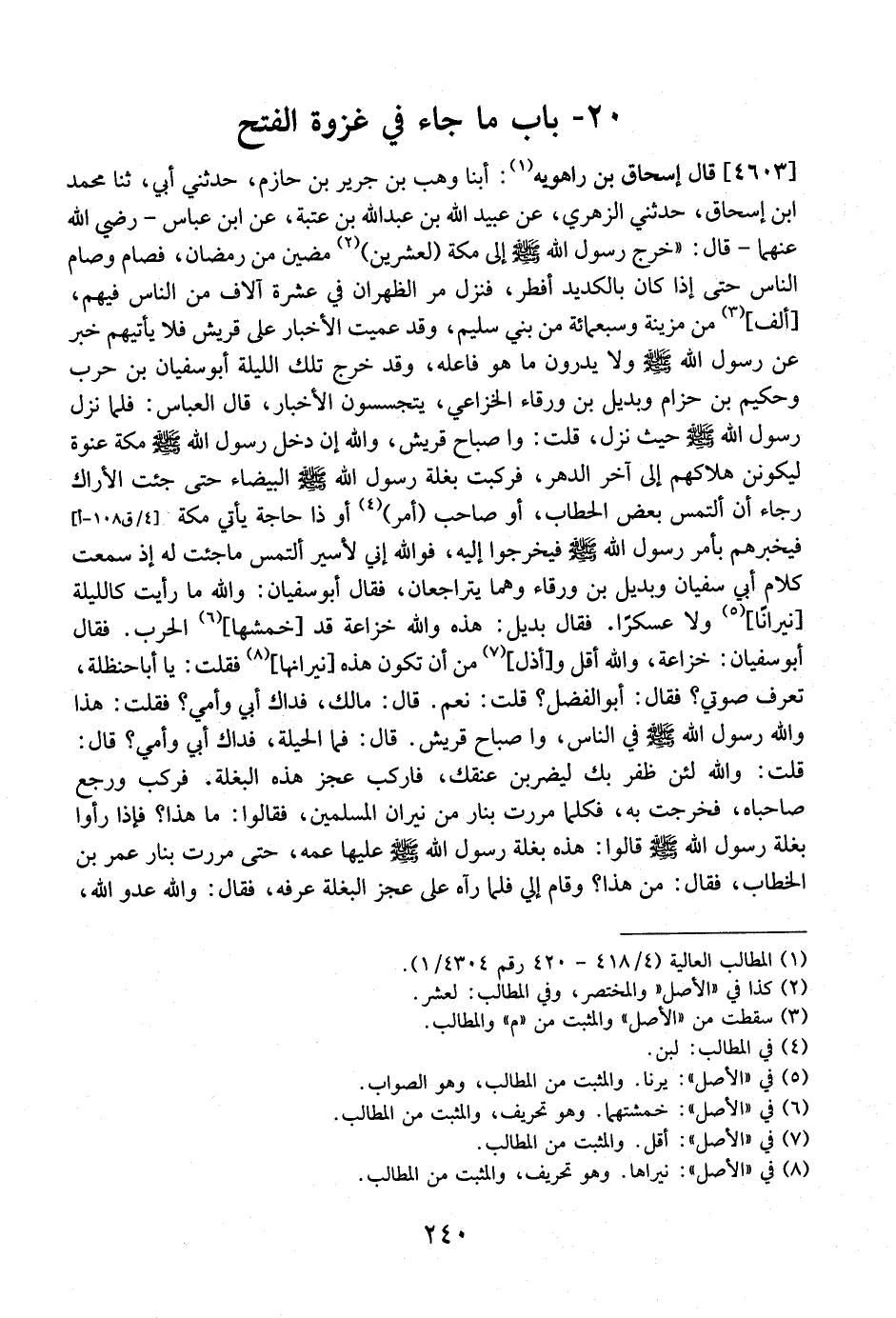 4603 - قَالَ إسحاق بن راهويه: أبنا وَهْبُ بْنُ جَرِيرِ بْنِ حَازِمٍ، حَدَّثَنِي أَبِي، ثنا محمد ابن إِسْحَاقَ، حَدَّثَنِي الزُّهْرِيِّ، عَنْ عُبَيْدِ اللَّهِ بْنِ عَبْدِ اللَّهِ بْنِ عُتْبَةَ، عَنِ ابْنِ عَبَّاسٍ- رَضِيَ اللَّهُ عَنْهُمَا- قَالَ: "خَرَجَ رَسُولُ اللَّهِ - صَلَّى اللَّهُ عَلَيْهِ وَسَلَّمَ - إِلَى مَكَّةَ لِعِشْرِينَ مَضَيْنَ مِنْ رَمَضَانَ، فَصَامَ وَصَامَ النَّاسُ حَتَّى إِذَا كَانَ بِالْكَدِيدِ أفطر، فنزلت مر الظُّهْرَانِ فِي عَشَرَةِ آلَافٍ مِنَ النَّاسِ فِيهِمْ، ألف، من مزينة وسبعمائة مِنْ بَنِي سُلَيْمٍ، وَقَدْ عَمِيَتِ الْأَخْبَارُ عَلَى قُرَيْشٍ فَلَا يَأتِيهِمْ خَبَرٌ عَنْ رَسُولِ اللَّهِ - صَلَّى اللَّهُ عَلَيْهِ وَسَلَّمَ - وَلَا يَدْرُونَ مَا هُوَ فَاعِلُهُ، وَقَدْ خَرَجَ تِلْكَ اللَّيْلَةَ أَبُو سُفْيَانَ بْنُ حَرْبٍ وَحَكِيمُ بْنُ حِزَامٍ وَبَدِيلُ بْنُ وَرْقَاءَ الْخُزَاعِيِّ، يَتَجَسَّسُونَ الْأَخْبَارَ، قَالَ الْعَبَّاسُ: فَلَمَّا نَزَلَ رَسُولُ اللَّهِ - صَلَّى اللَّهُ عَلَيْهِ وَسَلَّمَ - حَيْثُ نَزَلَ، قُلْتُ: واصَباح قُرَيْشٌ، وَاللَّهِ إِنْ دَخَلَ رَسُولُ اللَّهِ - صَلَّى اللَّهُ عَلَيْهِ وَسَلَّمَ - مَكَّةَ عَنْوَةً لَيَكُونَنَّ هَلَاكُهُمْ إِلَى آخِرِ الدَّهْرِ، فَرَكِبْتُ بَغْلَةَ رَسُولِ اللَّهِ - صَلَّى اللَّهُ عَلَيْهِ وَسَلَّمَ - الْبَيْضَاءَ حَتَّى جِئْتَ الْآرَاكَ رَجَاءَ أن ألتمس بعض الحطاب، أَوْ صَاحِبَ أَمْرٍ أَوْ ذَا حَاجَةٍ يَأْتِي مَكَّةَ فَيُخْبِرَهُمْ بِأَمْرِ رَسُولِ اللَّهِ - صَلَّى اللَّهُ عَلَيْهِ وَسَلَّمَ - فَيَخْرُجُوا إِلَيْهِ، فَوَاللَّهِ إِنِّي لِأَسِيرَ أَلْتَمِسُ مَا جِئْتُ لَهُ إِذْ سَمِعْتُ كَلَامَ أَبِي سُفْيَانَ وَبَدِيلَ بْنِ وَرْقَاءَ وَهُمَا يَتَرَاجَعَانِ، فَقَالَ أَبُو سُفْيَانَ: وَاللَّهِ مَا رَأَيْتُ كَاللَّيْلَةِ نِيرَانًا وَلَا عَسْكَرًا. فَقَالَ بَدِيلٌ: هَذِهِ وَاللَّهِ خزاعة قد خمشها الْحَرْبُ. فَقَالَ أَبُو سُفْيَانَ: خُزَاعَةُ، وَاللَّهِ أَقَلُّ وأذل مِنْ أَنْ تَكُونَ هَذِهِ نِيرَانُهَا، فَقُلْتُ: يَا أَبَا حَنْظَلَةَ، تَعَرَّفْ صَوْتِي؟ فَقَالَ: أَبُو الْفَضْلِ؟ قُلْتُ: نَعَمْ. قَالَ: مَالَكَ، فِدَاكَ أَبِي وَأُمِّي؟ فَقُلْتُ: هَذَا وَاللَّهِ رَسُولُ اللَّهِ - صَلَّى اللَّهُ عَلَيْهِ وسلم - في الناس، وا صباح قُرَيْشٍ. قَالَ: فَمَا الْحِيلَةُ، فِدَاكَ أَبِي وَأُمِّي؟ قَالَ: قُلْتُ: وَاللَّهِ لَئِنْ ظَفَرَ بِكَ لَيَضْرِبَنَّ عُنَقَكِ، فَارْكَبْ عَجُزَ هَذِهِ الْبَغْلَةَ. فَرَكِبَ وَرَجَعَ صَاحِبَاهُ، فَخَرَجْتُ بِهِ، فَكُلَّمَا مَرَرْتُ بِنَارٍ مِنْ نِيرَانِ الْمُسْلِمِينَ، فَقَالُوا: مَا هَذَا؟ فَإِذَا رَأَوْا بغلة رَسُولِ اللَّهِ - صَلَّى اللَّهُ عَلَيْهِ وَسَلَّمَ - قَالُوا؟ هَذِهِ بَغْلَةُ رَسُولِ اللَّهِ - صَلَّى اللَّهُ عَلَيْهِ وَسَلَّمَ - عَلَيْهَا عَمُّهُ، حَتَّى مَرَرْتُ بِنَارِ عُمَرَ بْنِ الْخَطَّابِ، فَقَالَ: مَنْ هَذَا؟ وَقَامَ إِلَيَّ فَلَمَّا رَآهُ عَلَى عَجُزِ الْبَغْلَةِ عَرَفَهُ، فَقَالَ: وَاللَّهِ عَدُوُّ اللَّهِ،