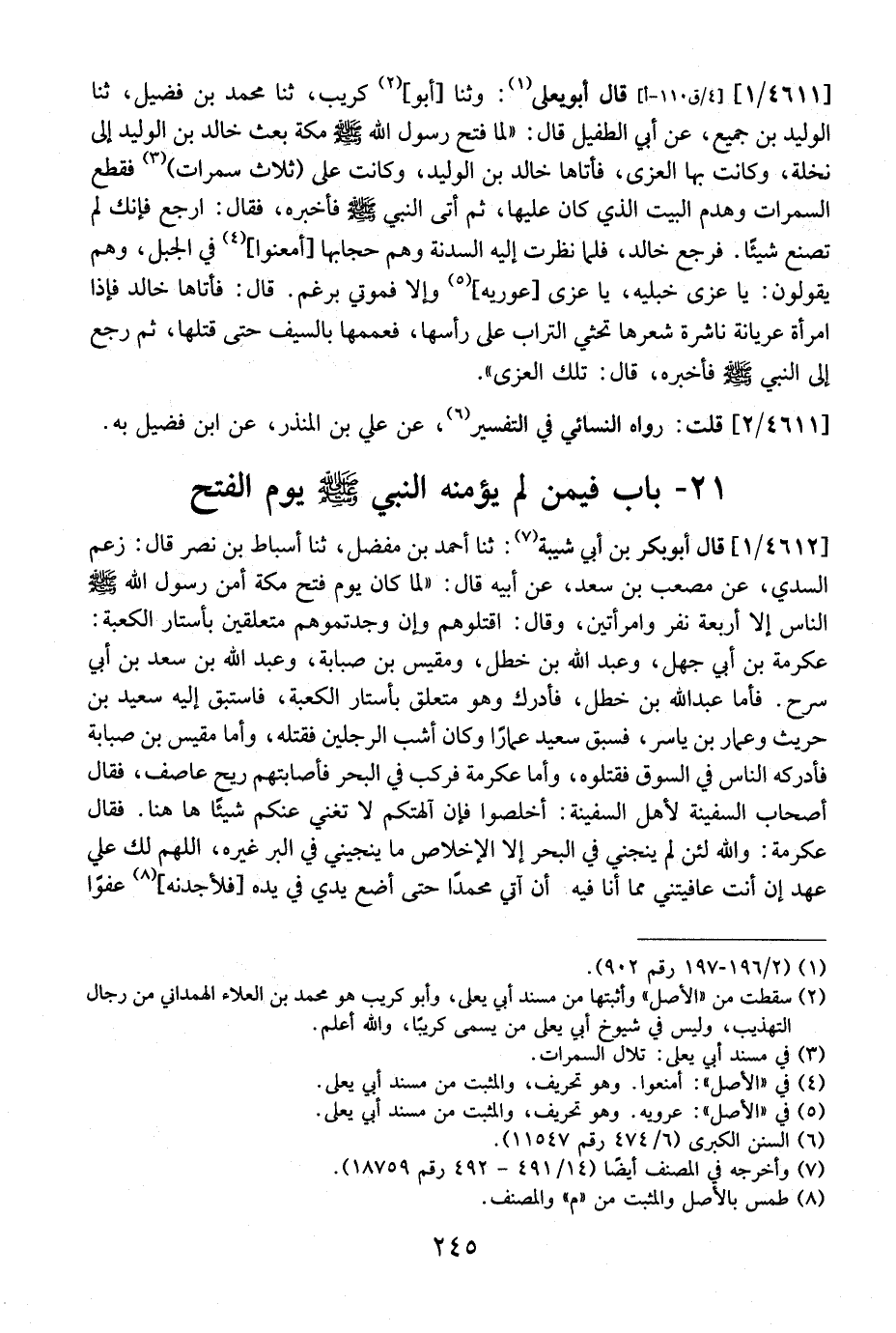 4611 / 1 - قَالَ أَبُو يَعْلَى: وَثَنَا أَبُو كُرَيْبٍ، ثَنَا مُحَمَّدُ بْنُ فُضَيْلٍ، ثنا الْوَلِيدِ بْنِ جُمَيْعٍ، عَنْ أَبِي الطُّفَيْلِ قَالَ: "لَمَّا فَتَحََ رَسُولُ اللَّهِ - صَلَّى اللَّهُ عَلَيْهِ وَسَلَّمَ - مَكَّةَ بَعَثَ خَالِدَ بْنَ الْوَلِيدِ إِلَى نَخْلَةٍ، وَكَانَتْ بِهَا الْعُزَّى، فَأَتَاهَا خَالِدُ بْنُ الْوَلِيدِ، وَكَانَتْ عَلَى (ثَلَاثِ سَمُرَاتٍ) فَقَطَعَ السَّمُرَاتِ وَهَدَمَ الْبَيْتَ الَّذِي كَانَ عَلَيْهَا، ثُمَّ أَتَى النَّبِيَّ - صَلَّى اللَّهُ عَلَيْهِ وَسَلَّمَ - فَأَخْبَرَهُ، فَقَالَ: ارْجِعْ فَإِنَّكَ لَمْ تَصْنَعْ شَيْئًا. فَرَجَعَ خَالِدٌ، فَلَمَّا نَظَرَتْ إِلَيْهِ السدنة وهم حجابها أمعنوا، في الجبل، وهم يقولون: يا عزى خبليه، يا عزى عوريه وإلا فموتي برغم. قَالَ: فَأَتَاهَا خَالِدٌ فَإِذَا امْرَأَةٌ عُرْيَانَةٌ نَاشِرَةٌ شَعْرَهَا تَحْثِي التُّرَابَ عَلَى رَأْسِهَا، فَعَمَّمَهَا بِالسَّيْفِ حَتَّى قَتَلَهَا، ثُمَّ رَجَعَ إِلَى النَّبِيِّ - صَلَّى اللَّهُ عَلَيْهِ وَسَلَّمَ - فَأَخْبَرَهُ، قَالَ: تِلْكَ الْعُزَّى".