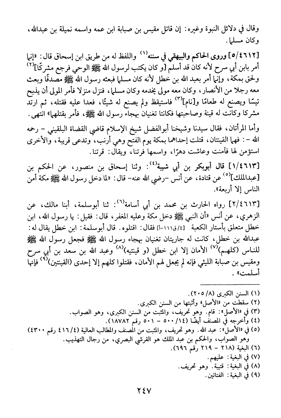 4612 / 5 - وَرَوَى الْحَاكِمُ وَالْبَيْهَقِيُّ فِي سُنَنِهِ وَاللَّفْظُ لَهُ مِنْ طَرِيقِ ابْنِ إِسْحَاقَ قَالَ: "إِنَّمَا أَمَرَ بِابْنِ أَبِي شرح لأنه كان قد أسلم وكَانَ يَكْتُبُ لِرَسُولِ اللَّهِ - صَلَّى اللَّهُ عَلَيْهِ وسلم - الوحي فرجع مشركًا، وَلَحِقَ بِمَكَّةَ، وَإِنَّمَا أَمَرَ بِعَبْدِ اللَّهِ بْنِ خَطَلٍ لِأَنَّهُ كَانَ مُسْلِمًا فَبَعَثَهُ رَسُولُ اللَّهِ - صلى الله عليه وسلم -