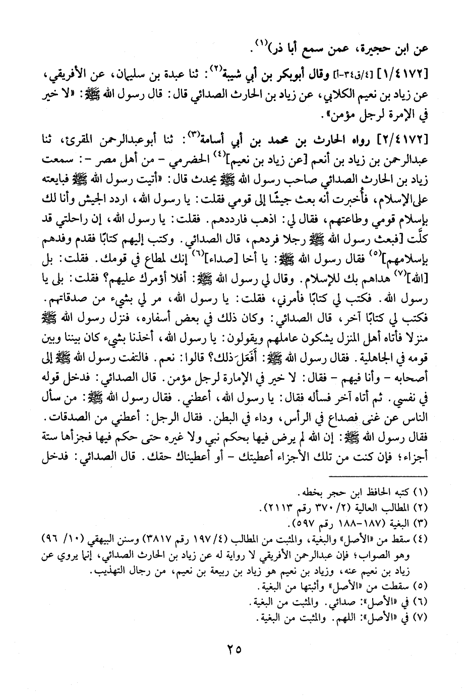 4172 / 2 - رَوَاهُ الْحَارِثُ بْنُ مُحَمَّدِ بْنِ أَبِي أُسَامَةَ: ثَنَا أَبْو عَبْدِ الرَّحْمَنِ الْمُقْرِئُ، ثَنَا عَبْدُ الرَّحْمَنِ بْنُ زِيَادِ بْنِ أَنْعَمَ عَنْ زياد بن نعيم، الْحَضْرَمِيُّ- مِنْ أَهْلِ مِصْرَ-: سَمِعْتُ زِيَادَ بْنَ الْحَارِثِ الصُّدَائِيَّ صَاحِبَ رَسُولِ اللَّهِ - صَلَّى اللَّهُ عَلَيْهِ وَسَلَّمَ - صَلَّى اللَّهُ عَلَيْهِ وَسَلَّمَ - يُحَدِّثُ قَالَ: "أَتَيْتُ رَسُولَ اللَّهِ - صَلَّى اللَّهُ عَلَيْهِ وَسَلَّمَ - فَبَايَعْتُهُ عَلَى الْإِسْلَامِ، فأُخبرت أَنَّهُ بَعَثَ جَيْشًا إِلَى قومي فقلت: يَا رَسُولَ اللَّهِ - صَلَّى اللَّهُ عَلَيْهِ وَسَلَّمَ - ارْدُدِ الْجَيْشَ وَأَنَا لَكَ بِإِسْلَامِ قَوْمِي وَطَاعَتِهِمْ، فَقَالَ لِي: اذْهَبْ فَارْدُدْهُمْ. فَقُلْتُ: يَا رَسُولَ اللَّهِ - صَلَّى اللَّهُ عَلَيْهِ وَسَلَّمَ - إن راحلتي قد كلَّت أفبعث رَسُولُ اللَّهِ - صَلَّى اللَّهُ عَلَيْهِ وَسَلَّمَ - رَجُلًا فردهم، قال الصدائي. وكتب إليهم كتابًا فقدم وفدهم بإسلامهم، فَقَالَ رَسُولُ اللَّهِ - صَلَّى اللَّهُ عَلَيْهِ وَسَلَّمَ -: يا أخا أصداء، إِنَّكَ لَمُطَاعٌ فِي قَوْمِكَ. فَقْلُتْ: بَلِ اللَّهُ، هداهم بك للإسلام. وقال لي رسوله الله ورده: أَفَلَا أؤمرك عَلَيْهِمْ؟ فَقُلْتُ: بَلَى يَا رَسُولَ اللَّهِ - صَلَّى اللَّهُ عَلَيْهِ وَسَلَّمَ -. فَكَتَبَ لِي كِتَابًا فَأَمَّرَنِي، فَقُلْتُ: يَا رَسُولَ اللَّهِ - صَلَّى اللَّهُ عَلَيْهِ وَسَلَّمَ -، مَرَّ لِي بِشَيْءٍ مِنْ صَدَقَاتِهِمْ. فَكَتَبَ لِي كِتَابًا آخَرَ، قَالَ الصُّدَائِيُّ: وَكَانَ ذَلِكَ فِي بعض أسفاره، فَنَزَلَ رَسُولُ اللَّهِ - صَلَّى اللَّهُ عَلَيْهِ وَسَلَّمَ - منزلا فأتاه أهل المنزلة يشكون عاملهم ويقولون: يَا رَسُولَ اللَّهِ - صَلَّى اللَّهُ عَلَيْهِ وَسَلَّمَ -، أَخَذَنَا بِشَيْءٍ كَانَ بَيْنَنَا وَبَيْنَ قَوْمِهِ فِي الجاهلية. فقال رسوله اللَّهِ - صَلَّى اللَّهُ عَلَيْهِ وَسَلَّمَ -: أَفَعَلَ ذَلِكَ؟ قَالُوا: نَعَمْ. فَالْتَفَتَ رَسُولُ اللَّهِ - صَلَّى اللَّهُ عَلَيْهِ وَسَلَّمَ - إِلَى أَصْحَابِهِ- وَأَنَا فِيهِمْ- فَقَالَ: لَا خَيْرَ فِي الْإِمَارَةِ لِرَجُلٍ مُؤْمِنٍ. قَالَ الصُّدَائِيُّ: فَدَخَلَ قَوْلُهُ فِي نَفْسِي. ثُمَّ أَتَاهُ آخر فسأله فقال: يا رسوله اللَّهِ، أَعْطِنِي. فَقَالَ رَسُولُ اللَّهِ - صَلَّى اللَّهُ عَلَيْهِ وَسَلَّمَ -: من سأل النالص عن غِنًى فَصُدَاعٌ فِي الرَّأْسِ، وَدَاءٌ فِي الْبَطْنِ. فَقَالَ الرَّجُلُ: أَعْطِنِي مِنَ الصَّدَقَاتِ. فَقَالَ رَسُولُ اللَّهِ - صَلَّى اللَّهُ عَلَيْهِ وَسَلَّمَ -: إِنَّ اللَّهَ لَمْ يَرْضَ فِيهَا بِحُكْمِ نَبِيٍّ وَلَا غَيْرِهِ حَتَّى حَكَمَ فِيهَا فَجَزَّأَهَا سِتَّةَ أَجْزَاءَ؟ فَإِنْ كُنْتَ مِنْ تِلْكَ الْأَجْزَاءِ أَعْطَيْتُكَ- أَوْ أَعْطَيْنَاكَ حَقَّكَ. قَالَ الصِّدَائِيُّ: فَدَخَلَ