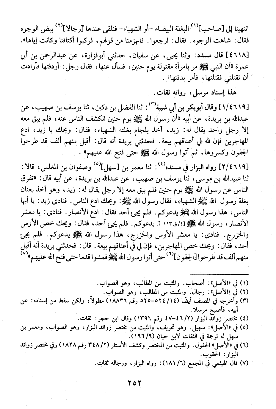 4619 / 2 - رَوَاهُ الْبَزَّارُ فِي مُسْنَدِهِ: ثنا معمر بن سهل وَصَفْوَانُ بْنُ الْمُغَلِّسِ، قَالَا: ثنا عُبَيْدُ اللَّهِ بْنُ مُوسَى، ثنا يُوسُفُ بْنُ صُهَيْبٍ، عَنْ عَبْدِ اللَّهِ بْنِ بُرَيْدَةَ، عَنْ أَبِيهِ قَالَ: "تَفَرَّقَ النَّاسُ عَنْ رَسُولِ اللَّهِ - صَلَّى اللَّهُ عَلَيْهِ وَسَلَّمَ - يَوْمَ حُنَيْنٍ فَلَمْ يَبْقَ مَعَهُ إِلَّا رَجُلٌ يُقَالُ لَهُ: زَيْدٌ، وَهُوَ آخِذٌ بِعِنَانِ بَغْلَةِ رَسُولِ اللَّهِ - صَلَّى اللَّهُ عَلَيْهِ وسلم - الشهباء، فَقَالَ رَسُولُ اللَّهِ - صَلَّى اللَّهُ عَلَيْهِ وَسَلَّمَ -: وَيْحَكَ ادْعُ النَّاسَ. فَنَادَى زَيْدٌ: يَا أَيُّهَا النَّاسُ، هَذَا رَسُولُ اللَّهِ - صَلَّى اللَّهُ عَلَيْهِ وَسَلَّمَ - يَدْعُوكُمْ. فَلَمْ يَجِئْ أَحَدٌ فَقَالَ: ادْعُ الْأَنْصَارَ. فَنَادَى: يَا مَعْشَرُ الْأَنْصَارِ، رَسُولُ اللَّهِ - صَلَّى اللَّهُ عَلَيْهِ وَسَلَّمَ - يَدْعُوكُمْ. فَلَمْ يَجِئْ أَحَدٌ، فَقَالَ: وَيْحَكَ خُصَّ الَأَوْسَ وَالْخَزْرَجَ. فَنَادَى: يَا مَعْشَرَ الْأَوْسِ وَالْخَزْرَجِ، هَذَا رَسُولُ اللَّهِ - صَلَّى اللَّهُ عَلَيْهِ وَسَلَّمَ - يَدْعُوكُمْ. فَلَمْ يَجِئْ أَحَدٌ، فَقَالَ: وَيْحَكَ خُصَّ الْمُهَاجِرِينَ، فَإِنَّ لِي فِي أَعْنَاقِهِمْ بَيْعَةٌ. قَالَ: فَحَدَّثَنِي بُرَيْدَةُ أَنَّهُ أقبل منهم ألف قد طرحوا الجفون، حَتَّى أَتَوْا رَسُولَ اللَّهِ - صَلَّى اللَّهُ عَلَيْهِ وَسَلَّمَ - فَمَشَوْا قُدُمًا حَتَّى فَتَحَ اللَّهُ عَلَيْهِمْ "