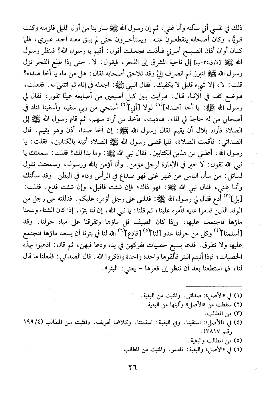 ذَلِكَ فِي نَفْسِي أَنِّي سَأَلْتُهُ وَأَنَا غَنِيٌّ، ثُمَّ إِنَّ رَسُولَ اللَّهِ - صَلَّى اللَّهُ عَلَيْهِ وَسَلَّمَ - سَارَ بِنَا مِنْ أَوَّلِ اللَّيْلِ فَلَزِمْتُهُ وَكُنْتُ قَوِيًّا، وَكَانَ أَصْحَابُهُ يَنْقَطِعُونَ عَنْهُ. وَيَسْتَأْخِرُونَ حَتَّى لَمْ يَبْقَ مَعَهُ أَحَدٌ غَيْرِي، فَلَمَّا كَانَ أَوَانُ أَذَانِ الصُّبْحِ أَمَرَنِي فَأَذَّنْتُ فَجَعَلْتُ أقول: أقيم يَا رَسُولَ اللَّهِ - صَلَّى اللَّهُ عَلَيْهِ وَسَلَّمَ -؟ فَيَنْظُرُ رَسُولُ اللَّهِ - صَلَّى اللَّهُ عَلَيْهِ وَسَلَّمَ - إِلَى نَاحِيَةِ الْمَشْرِقِ إِلَى الْفَجْرِ، فَيَقُولُ: لَا. حَتَّى إِذَا طَلَعَ الْفَجْرُ نَزَلَ رَسُولُ اللَّهِ - صَلَّى اللَّهُ عَلَيْهِ وَسَلَّمَ - فَتَبَرَّزَ ثُمَّ انصرف إليَّ وَقَدْ تَلَاحَقَ أَصْحَابُهُ فَقَالَ: هَلْ مِنْ مَاءٍ يَا أَخَا صُدَاءٍ؟ قُلْتُ: لَا، إِلَّا شَيْءٌ قَلِيلٌ لَا يَكْفِيكَ. فَقَالَ النَّبِيُّ - صَلَّى اللَّهُ عَلَيْهِ وَسَلَّمَ -: اجْعَلْهُ فِي إِنَاءٍ ثُمَّ ائْتِنِي بِهِ. فَفَعَلْتُ، فَوَضَعَ كَفَّهُ فِي الْإِنَاءِ قَالَ: فَرَأَيْتُ بَيْنَ كُلِّ إِصْبُعَيْنِ مِنْ أَصَابِعِهِ عَيْنًا تَفُورُ، فَقَالَ لِي رَسُولُ اللَّهِ - صَلَّى اللَّهُ عَلَيْهِ وَسَلَّمَ -: يَا أَخَا صُدَاءٍ، لَوْلَا أني، أستحي أن رَبِّي سُقِينَا وَأَسْقَيْنَا فَنَادِ فِي أَصْحَابِي مَنْ لَهُ حَاجَةٌ فِي الْمَاءِ. فَنَادَيْتُ، فَأَخَذَ مَنْ أَرَادَ مِنْهُمْ، ثُمَّ قَامَ رَسُولُ اللَّهِ - صَلَّى اللَّهُ عَلَيْهِ وَسَلَّمَ - إِلَى الصَّلَاةِ فَأَرَادَ بِلَالٌ أَنْ يُقِيمَ فَقَالَ رَسُولُ اللَّهِ - صَلَّى اللَّهُ عَلَيْهِ وَسَلَّمَ -: إِنَّ أَخَا صُدَاءٍ أَذَّنَ وَهُوَ يُقِيمُ. قَالَ الصُّدَائِيُّ: فَأَقَمْتُ الصَّلَاةَ، فَلَمَّا قَضَى رَسُولُ اللَّهِ - صَلَّى اللَّهُ عَلَيْهِ وَسَلَّمَ - الصَّلَاةُ أتيته بالكتابين، فقلت: يَا رَسُولَ اللَّهِ - صَلَّى اللَّهُ عَلَيْهِ وَسَلَّمَ -، اعْفِنِي مِنْ هَذَيْنِ الْكِتَابَيْنِ. فَقَالَ نَبِيُّ اللَّهِ - صَلَّى اللَّهُ عَلَيْهِ وَسَلَّمَ -: وما بدا لك فَقُلْتُ: سَمِعْتُكَ يَا نَبِيَّ اللَّهِ تَقُولُ: لَا خَيْرَ فِي الْإِمَارَةِ لِرَجُلٍ مُؤْمِنٍ. وَأَنَا أُؤْمِنُ بالله ور سوله، وسمعتك تقول لسائل: مَنْ سَأَلَ النَّاسَ عَنْ ظَهْرِ غِنًى فَهُوَ صُدَاعٌ فِي الرَّأْسِ وَدَاءٌ فِي الْبَطْنِ. وَقَدْ سألتك وأنا غنى، فَقَالَ نَبِيُّ اللَّهِ - صَلَّى اللَّهُ عَلَيْهِ وَسَلَّمَ -: فهو ذَاكَ؟ فَإِنْ شِئْتَ فَاقْبَلْ، وَإِنْ شِئْتَ فَدَعْ. فقلت: بل، أَدَعُ فَقَالَ لِي رَسُولُ اللَّهِ - صَلَّى اللَّهُ عَلَيْهِ وَسَلَّمَ -: فَدُلَّنِي عَلَى رَجُلٍ أُؤَمِّرُهُ عَلَيْكُمْ. فَدَلَلْتُهُ عَلَى رَجُلٍ مِنَ الْوَفْدِ الَّذِينَ قَدِمُوا عَلَيْهِ فَأَمَّرَهُ عَلَيْنَا، ثُمَّ قُلْنَا: يَا نَبِيَّ اللَّهِ، إِنَّ لَنَا بِئْرًا، إِذَا كَانَ الشِّتَاءُ وسعنا ماؤها فاجتمعنا عَلَيْهَا، وَإِذَا كَانَ الصَّيْفُ قَلَّ مَاؤُهَا وَتَفَرَّقْنَا على مياه حولنا. وقد أسلمنا، وكل من حولنا عدو لنا، فَادْعُ اللَّهَ لَنَا فِي بِئْرِنَا أَنْ يَسِعَنَا مَاؤُهَا فَنَجْتَمِعَ عَلَيْهَا وَلَا نَتَفَرَّقُ. فَدَعَا بِسَبْعِ حَصَيَاتٍ فَفَرَكَهُنَّ فِي يَدِهِ وَدَعَا فِيهِنَّ، ثُمَّ قَالَ: اذْهَبُوا بِهَذِهِ الْحَصَيَاتِ؟ فَإِذَا أَتَيْتُمُ الْبِئْرَ فَأَلْقُوهَا وَاحِدَةً وَاحِدَةً وَاذْكُرُوا اللَّهَ. قَالَ الصُّدَائِيُّ: فَفَعَلْنَا مَا قَالَ لَنَا، فَمَا اسْتَطَعْنَا بَعْدُ أَنْ نَنْظُرَ إِلَى قَعْرِهَا- يَعْنِي: الْبِئْرَ".