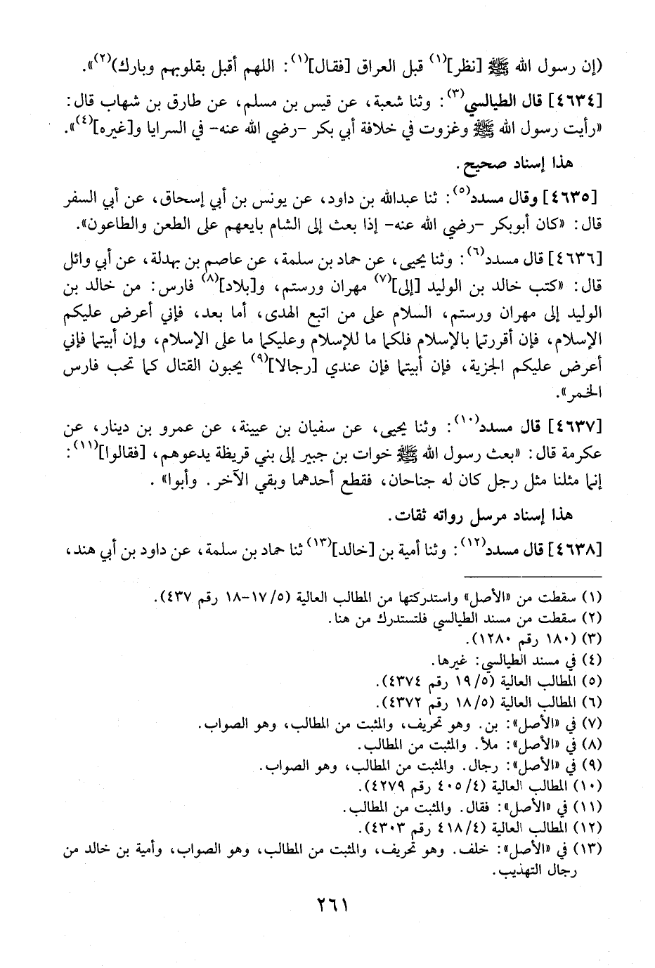 4636 - قَالَ مُسَدَّدٌ: وثنا يَحْيَى، عَنْ حَمَّادُ بْنُ سَلَمَةَ، عَنْ عَاصِمِ بْنِ بَهْدَلَةَ، عَنْ أَبِي وائلِ قَالَ: "كَتَبَ خَالِدُ بْنُ الوليد إلى مهران ورستم، وبلاد فَارِسَ: مِنْ خَالِدِ بْنِ الْوَلِيدِ إِلَى مْهَرَانَ وَرُسْتُمَ، السَّلَامُ عَلَى مَنِ اتَّبَعَ الْهُدَى، أَمَّا بعد، فإني أعرض عليكم الْإِسْلَامَ، فَإِنْ أَقْرَرْتُمَا بِالْإِسْلَامِ فَلَكُمَا مَا لِلْإِسْلَامِ وَعَلَيْكُمَا مَا عَلَى الْإِسْلَامِ، وَإِنْ أَبَيْتُمَا فَإِنِّي أعرض عليكم الْجِزْيَةَ، فَإِنْ أَبَيْتُمَا فَإِنَّ عِنْدِي رِجَالًا، يُحِبُّونَ الْقِتَالَ كَمَا تُحِبُّ فَارِسٌ الْخَمْرَ".