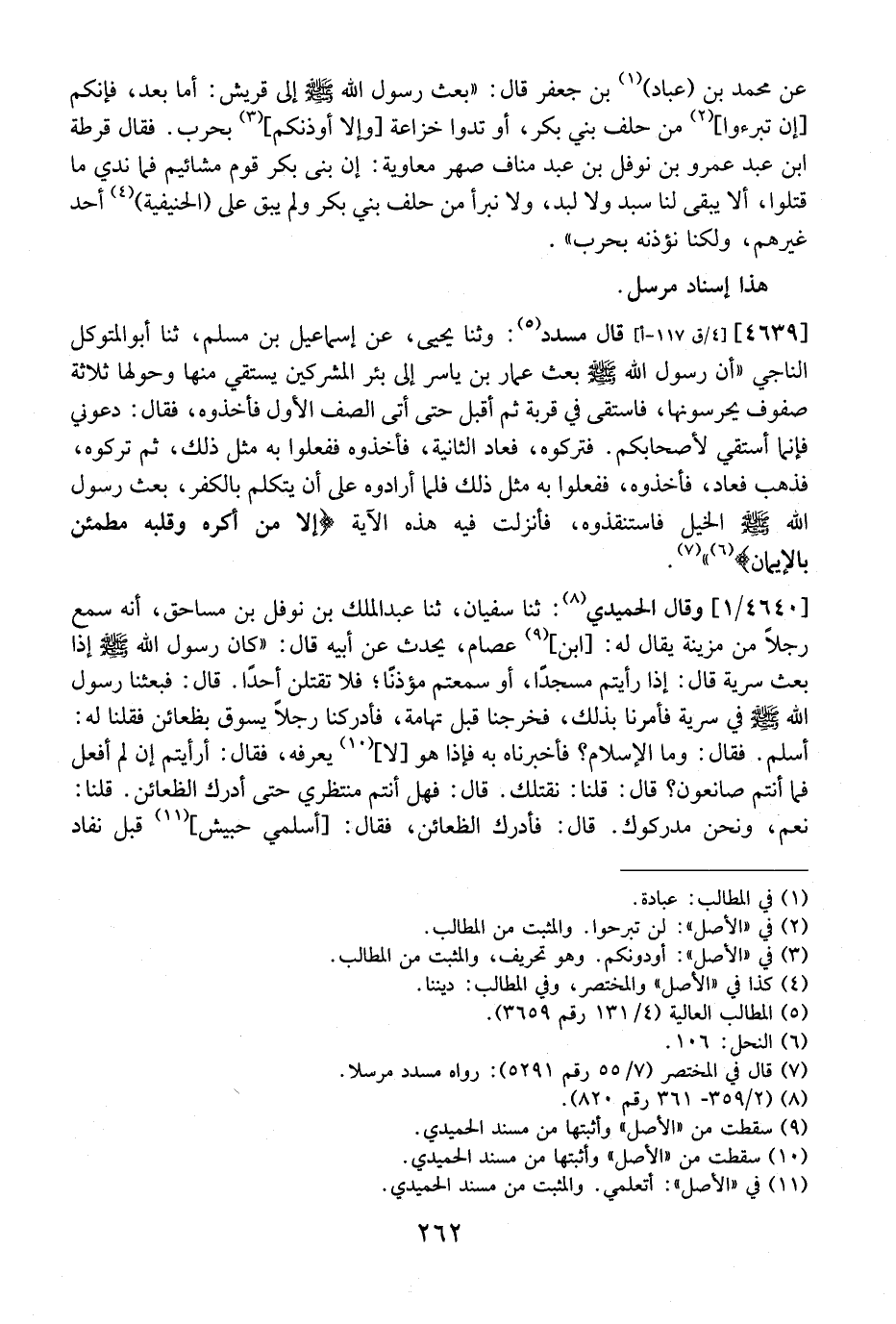 4640 / 1 - وَقَالَ الْحُمَيْدِيُّ: ثنا سُفْيَانُ، ثنا عَبْدُ الْمَلِكِ بن نوفل بن مساحق، أنه سع رجلاً من مزينة يقال له: ابن عِصَامٌ، يُحَدِّثُ عَنْ أَبِيهِ قَالَ: "كَانَ رَسُولُ اللَّهِ - صَلَّى اللَّهُ عَلَيْهِ وَسَلَّمَ - إِذَا بَعَثَ لسرية قَالَ: إِذَا رَأَيْتُمْ مَسْجِدًا، أَوْ سَمِعْتُمْ مُؤَذِّنًا؟ فَلَا تَقْتُلَنَّ أَحَدًا. قَالَ: فَبَعَثَنَا رَسُولُ اللَّهِ - صَلَّى اللَّهُ عَلَيْهِ وَسَلَّمَ - فِي سَرِيَّةٍ فَأَمَرَنَا بِذَلِكَ، فَخَرَجْنَا قَبْلَ تُهَامَةَ، فَأَدْرَكْنَا رَجُلًا يَسُوقُ بِظَعَائِنَ فَقُلْنَا لَهُ: أَسْلِمْ. فَقَالَ: وَمَا الْإِسْلَامُ؟ فَأَخْبَرْنَاهُ بِهِ فَإِذَا هُوَ لا يَعْرِفُهُ، فَقَالَ: أَرَأَيْتُمْ إِنْ لَمْ أَفْعَلْ فَمَا أَنْتُمْ صَانِعُونَ؟ قَالَ: قُلْنَا: نَقْتُلَكَ. قَالَ: فَهَلْ أَنْتُمْ مُنْتَظِرِيَّ حَتَّى أُدْرِكَ الظَّعَائِنَ. قُلْنَا: نَعَمْ، ونحن مدركوك. قال: فأدرك الظعائن، فقال: أسلمي حبيش قبل نفاد