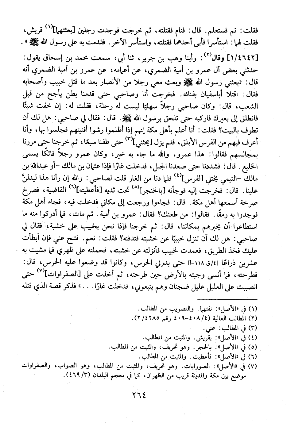 4642 / 1 - وقال: وأبنا وَهْبُ بْنُ جَرِيرٍ، ثَنَا أَبِي، سَمِعْتُ مُحَمَّدَ بْنَ إِسْحَاقَ يَقُولُ: حَدَّثَنِي بَعْضُ آلِ عَمْرِو بْنِ أُمَيَّةَ الضَّمْرِيِّ، عَنْ أَعْمَامِهِ، عَنْ عَمْرِو بْنِ أُمَيَّةَ الضَّمْرِيِّ أَنَّهُ قَالَ: "بَعَثَنِي رَسُولُ اللَّهِ - صَلَّى اللَّهُ عَلَيْهِ وَسَلَّمَ - وَبَعَثَ مَعِي رَجُلًا مِنَ الْأَنْصَارِ بَعْدَ مَا قُتِلَ خَبِيبٌ وَأَصْحَابُهُ فَقَالَ: اقْتُلَا أَبَا سُفْيَانَ بِفِنَائِهِ. فَخَرَجْتُ أَنَا وَصَاحِبِي حَتَّى قَدِمْنَا بَطْنَ يَأْجَحَ مِنْ قِبَلِ الشُّعَبِ، قَالَ: وَكَانَ صَاحِبِي رَجُلًا سَهْلِيًّا لَيْسَتْ لَهُ رِحْلَةٌ، فَقُلْتُ لَهُ: إِنْ خِفْتَ شَيْئًا فَانْطَلِقْ إِلَى بَعِيرِكَ فَارْكَبْهُ حَتَّى تَلْحَقْ بِرَسُولِ اللَّهِ - صَلَّى اللَّهُ عَلَيْهِ وَسَلَّمَ -. قَالَ: فَقَالَ لي صاحبي: هل لك أن تطوف بِالْبَيْتِ؟ فَقُلْتُ: أَنَا أَعْلَمُ بِأَهْلِ مَكَّةَ إِنَّهُمْ إذا أظلموا رَشُّوا أَفْنِيَتَهُمْ فَجَلَسُوا بِهَا، وَأَنَا أَعْرِفُ فِيهِمْ مِنَ الْفَرْسِ الْأَبْلَقِ، فَلَمْ يَزَلْ يَحُثُّنِي حَتَّى طُفْنَا سَبْعًا، ثُمَّ خَرَجْنَا حَتَّى مَرَرْنَا بِمَجَالِسِهِمْ فَقَالُوا: هَذَا عَمْرُو، وَاللَّهِ مَا جَاءَ بِهِ خَيْرٌ، وكان عَمْرَو رَجُلًا فَاتِكًا يُسَمَّى الْخَلِيعُ. قَالَ: فَشَدَدْنَا حَتَّى صَعَدْنَا الْجَبَلَ، فَدَخَلْتُ غَارًا فَإِذَا عُثْمَانُ بْنُ مَالِكٍ- أَوْ عَبْدُ اللَّهِ بن مالك- التيمي يختلي لفرس فَلَمَّا دَنَا مِنَ الْغَارِ قُلْتُ لِصَاحِبِي: وَاللَّهِ إن رآنا هذا ليدلنَّ علينا. قال: فخرجت إليه فوجأته با لخنجر تحت ثديه فأعطيته القاضية، فصرخ صرخة أسمعها أَهْلُ مَكَّةَ. قَالَ: فَجَاءُوا وَرَجَعْتُ إِلَى مَكَانِي فَدَخَلْتُ فِيهِ، فَجَاءَ أَهْلُ مَكَّةَ فَوَجَدُوا بِهِ رَمَقًا. فَقَالُوا: مَنْ طَعَنَكَ؟ فَقَالَ: عَمْرُو بْنُ أُمَيَّةَ. ثُمَّ مَاتَ، فَمَا أَدْرَكُوا مِنْهُ مَا اسْتَطَاعُوا أَنْ يُخْبِرَهُمْ بِمَكَانِنَا، قَالَ: ثُمَّ خَرَجْنَا فَإِذَا نَحْنُ بِخَبِيبٍ عَلَى خَشَبَةٍ، فَقَالَ لِي صاحبي: هل لك أن تنزل خبيبًا عن خشبته فتدفنه؟ فَقُلْتُ: نَعَمْ. فَتَنَحَّ عَنِّي فَإِنْ أَبْطَأْتُ عَلَيْكَ فَخُذِ الطَّرِيقَ، فَعَمَدْتُ لِخَبِيبٍ فأنزلته عَنْ خَشَبَتِهِ، فَحَمَلْتُهُ عَلَى ظَهْرِي فَمَا مَشِيتُ بِهِ عِشْرِينَ ذِرَاعًا حَتَّى بَدَرَنِي الْحَرَسُ، وَكَانُوا قَدْ وَضَعُوا عَلَيْهِ الْحَرَسَ، قَالَ: فَطَرَحْتُهُ، فَمَا أَنْسَى وَجْبَتَهُ بالأرض حين طرحته، ثم أخذت على الصفراوات حَتَّى انْصَبَبْتُ عَلَى الْعَلِيلِ عَلِيلِ ضَجْنَانِ وَهُمْ يتبعوني، فدخلت غارًا ... " فذكر قصة الذي قتله