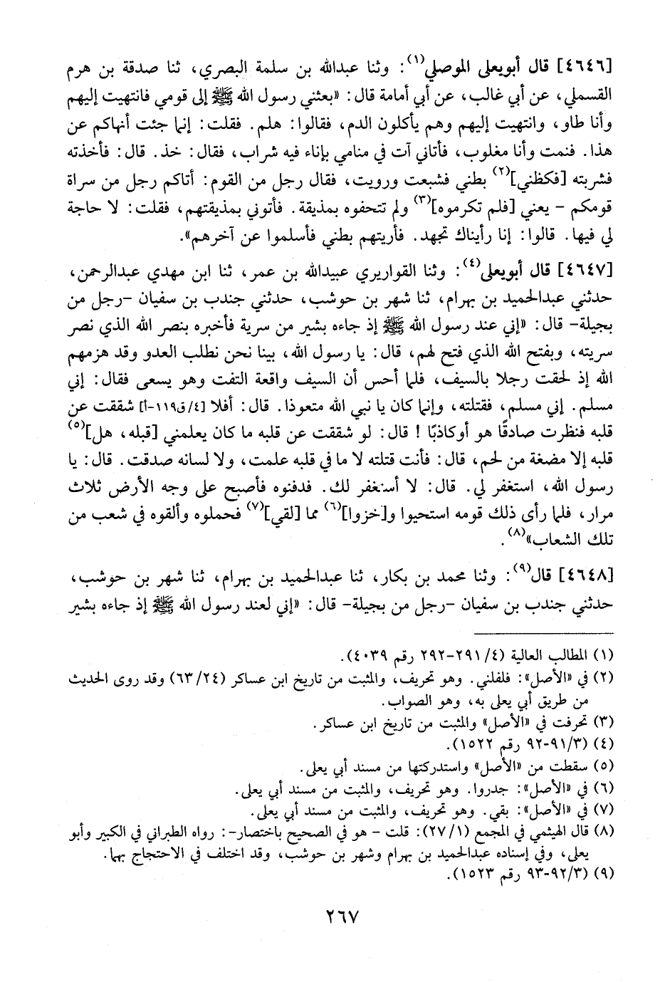 4647 - قَالَ أَبُو يَعْلَى: وثنا الْقَوَارِيرِيُّ عُبَيْدُ اللَّهِ بْنُ عُمَرَ، ثنا ابْنُ مَهْدِيٍّ عَبْدُ الرَّحْمَنِ، حَدَّثَنِي عَبْدُ الْحَمِيدِ بْنُ بِهْرَامٍ، ثَنَا شَهْرُ بْنُ حَوْشَبٍ، حَدَّثَنِي جُنْدُبُ بْنُ سُفْيَانَ- رَجُلٌ مِنْ بَجِيلَةَ- قَالَ: "إِنِّي عِنْدَ رَسُولِ اللَّهِ - صَلَّى اللَّهُ عَلَيْهِ وَسَلَّمَ - إِذْ جَاءَهُ بَشِيرٌ مِنْ سَرِيَّةٍ فَأَخْبَرَهُ بنصر الله الذي نصر لسريته، وَبِفَتْحِ اللَّهِ الَّذِي فَتَحَ لَهُمْ، قَالَ: يَا رَسُولَ اللَّهِ، بَيْنَا نَحْنُ نَطْلُبُ الْعَدُوَّ وَقَدْ هَزَمَهُمُ اللَّهُ إِذْ لَحِقْتُ رَجُلًا بِالسَّيْفِ، فَلَمَّا أَحَسَّ أَنَّ السَّيْفَ وَاقَعَهُ الْتَفَتَ وَهُوَ يَسْعَى فَقَالَ: إِنِّي مُسْلِمٌ. إِنِّي مُسْلِمٌ، فَقَتَلْتُهُ، وَإِنَّمَا كان يا نبي الله متعوذا. قَالَ: أَفَلَا شَقَقْتَ عَنْ قَلْبِهِ فَنَظَرْتَ صَادِقًا هو أوكاذبًا! قَالَ: لَوْ شَقَقْتُ عَنْ قَلْبِهِ مَا كَانَ يعلمني [قبله، هَلْ] قَلْبُهُ إِلَّا مُضْغَةً مِنْ لَحْمٍ، قَالَ: فَأَنْتَ قَتَلْتَهُ لَا مَا فِي قَلْبِهِ عَلِمْتَ، وَلَا لِسَانِهِ صَدَقْتَ. قَالَ: يَا رَسُولَ اللَّهِ، اسْتِغْفِرْ لِي. قَالَ: لَا أَسْتَغْفِرُ لَكَ. فَدَفَنُوهُ فَأَصْبَحَ عَلَى وَجْهِ الْأَرْضِ ثَلَاثَ مِرَارٍ، فَلَمَّا رَأَى ذلك قومه استحيوا وخزوا مما لقي فَحَمَلُوهُ وَأَلْقُوهُ فِي شِعْبٍ مِنْ تِلْكَ الشِّعَابِ ".