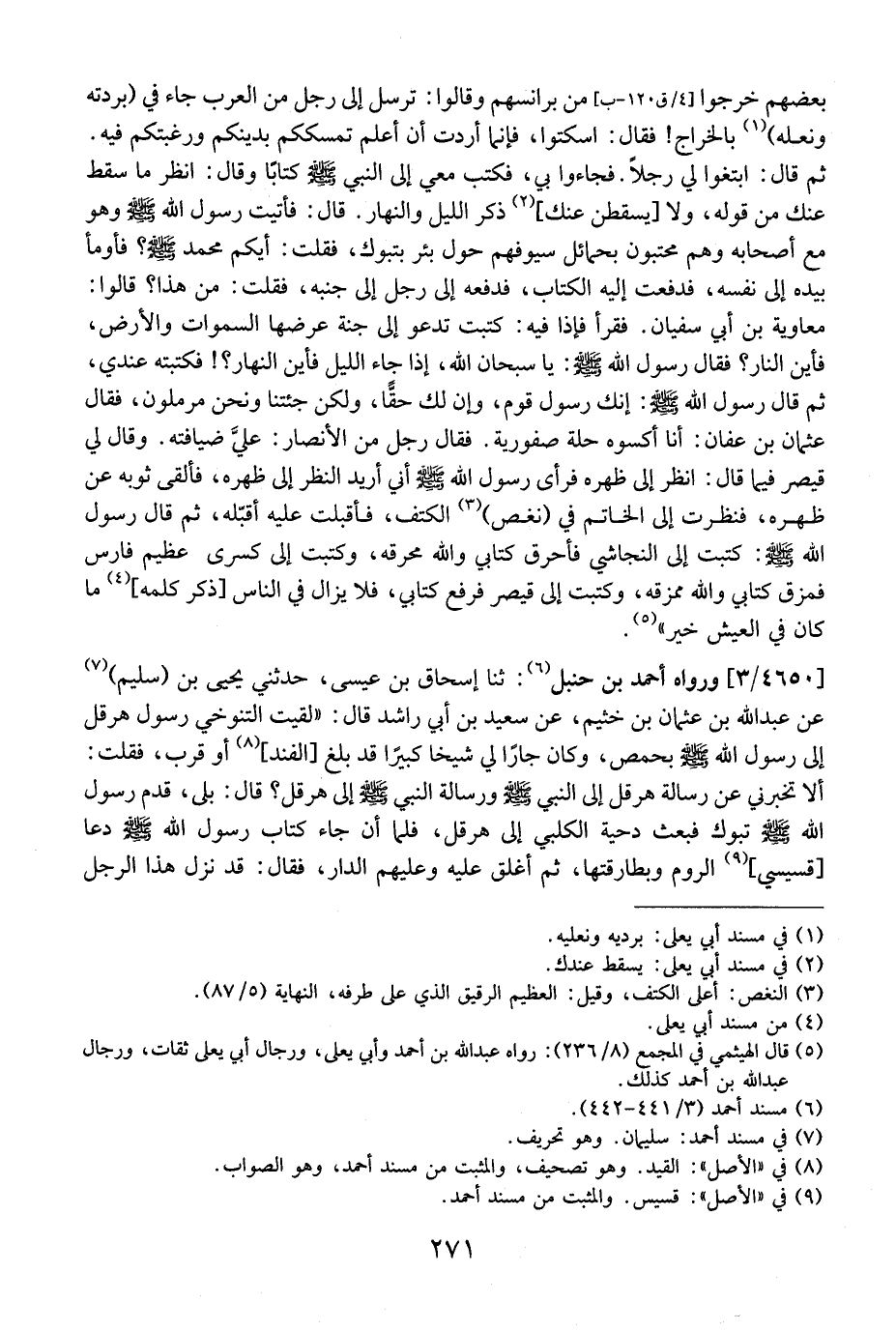 4650 / 3 - وَرَوَاهُ أَحْمَدُ بْنُ حَنْبَلٍ: ثَنَا إِسْحَاقُ بْنُ عِيسَى، حَدَّثَنِي يَحْيَى بْنُ (سُلَيْمٍ) عَنْ عَبْدِ اللَّهِ بْنِ عُثْمَانَ بْنِ خُثَيْمٍ، عَنْ سَعِيدِ بْنِ أَبِي رَاشِدٍ قَالَ: "لَقِيتُ التَّنُوخِيَّ رَسُولَ هِرْقَلَ إِلَى رَسُولِ اللَّهِ - صَلَّى اللَّهُ عَلَيْهِ وَسَلَّمَ - بِحْمِصٍ، وَكَانَ جَارًا لِي شَيْخًا كَبِيرًا قَدْ بَلَغَ الفند أَوْ قَرُبَ، فَقُلْتُ: أَلَا تُخْبِرُنِي عَنْ رِسَالَةِ هَِرَقْلَ إِلَى النَّبِيِّ - صَلَّى اللَّهُ عَلَيْهِ وَسَلَّمَ - وَرِسَالَةُ النَّبِيِّ - صَلَّى اللَّهُ عَلَيْهِ وَسَلَّمَ - إِلَى هِرَقْلَ؟ قَالَ: بَلَى، قَدِمَ رَسُولُ اللَّهِ - صَلَّى اللَّهُ عَلَيْهِ وَسَلَّمَ - تَبُوكَ فَبَعَثَ دِحْيَةَ الْكَلْبِيَّ إِلَى هِرَقْلَ، فَلَمَّا أَنْ جَاءَ كِتَابُ رَسُولِ اللَّهِ - صَلَّى اللَّهُ عَلَيْهِ وَسَلَّمَ - دَعَا قسيسي الرُّومِ وَبَطَارِقَتَهَا، ثُمَّ أَغْلَقَ عَلَيْهِ وَعَلَيْهِمُ الدَّارَ، فَقَالَ: قَدْ نَزَلَ هَذَا الرَّجُلُ